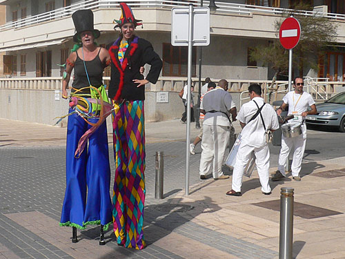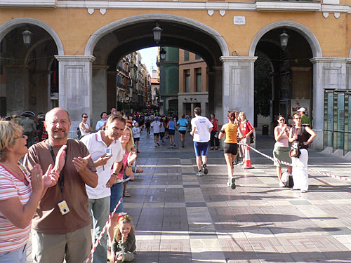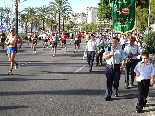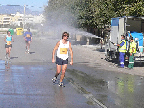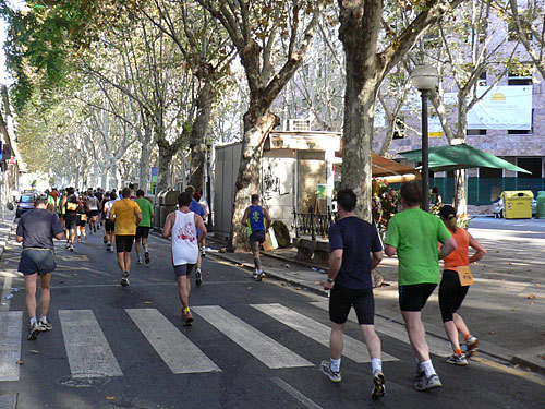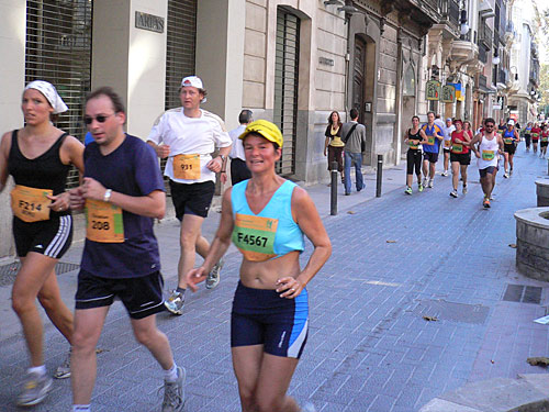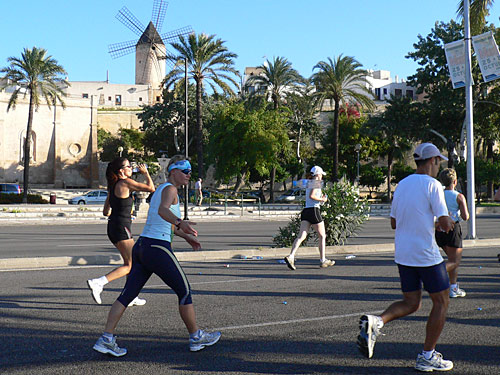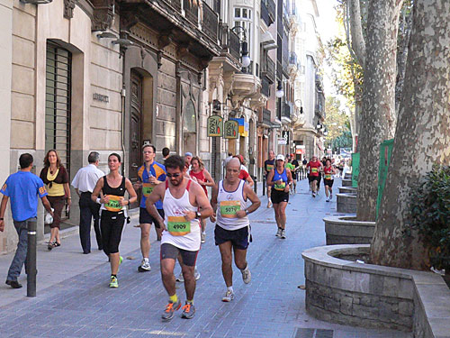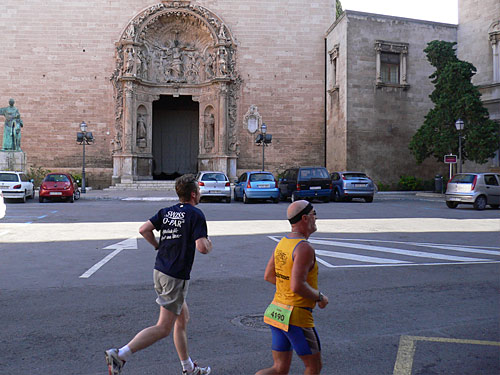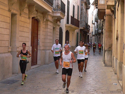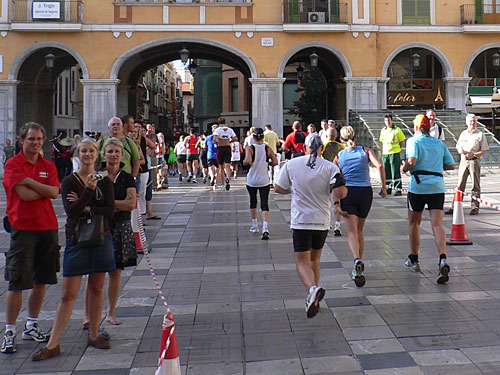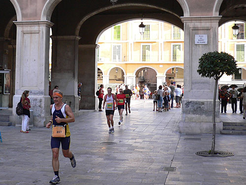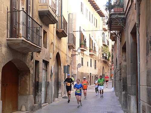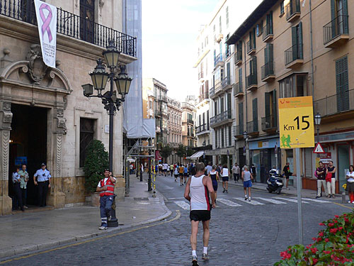 Die Straßen in der Stadt sind meist schattig und es ist trotz der Wärme gut zu laufen. Fast als kühl empfindet man die schmalen, mit Steinplatten gepflasterten Altstadtgassen, die wir nach der Carrer de Sant Miquel erreichen. Es geht um viele Winkel und Kurven, kein Mensch kann sich die Namen der Straßen, Plätze und Kirchen merken. Zuschauer gibt es keine, dafür sind die Straßen auch viel zu eng. Nur von den Balkons gibt es hin und wieder Applaus und Musik. Dafür sind die kleinen, gut besuchten Plätze richtige Stimmungsnester.