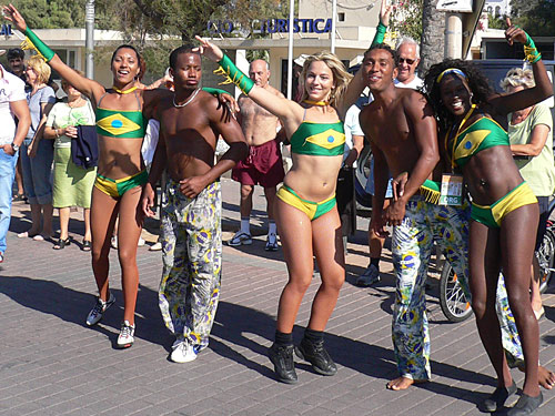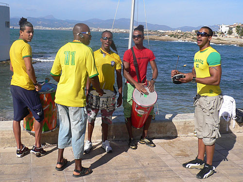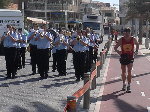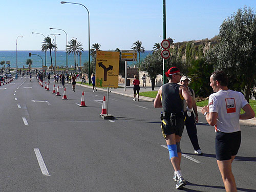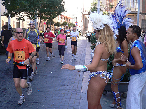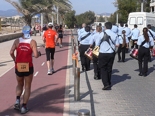 Am Placa d’Espanya erwartet uns dann ein Augenschmaus der anderen Art. Samba ist angesagt und jeder Läufer riskiert einen Blick auf die attraktiven Tänzerinnen. Klar, dass sich hier auch eine große Zuschauermenge aufhält. Danach laufen wir direkt auf die Küste zu, die Halbmarathon-Läuferinnen und –Läufer verabschieden sich nach rechts, die Marathonis folgen links der Küstenstraße, wo nach einem Kilometer die Halbdistanz erreicht wird.