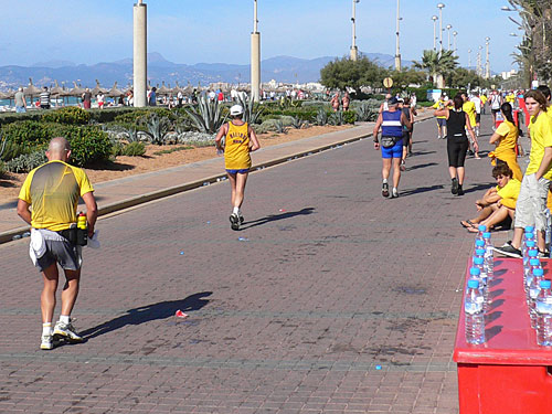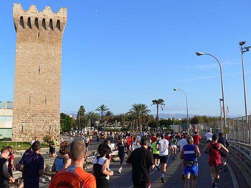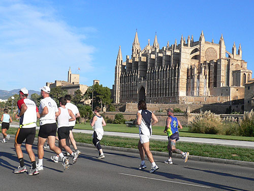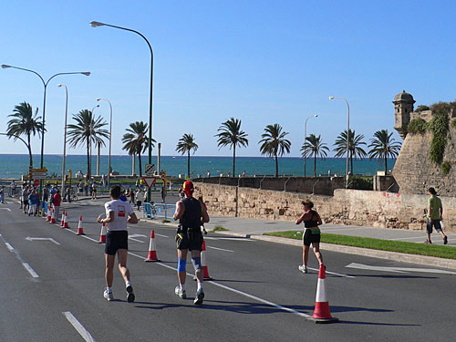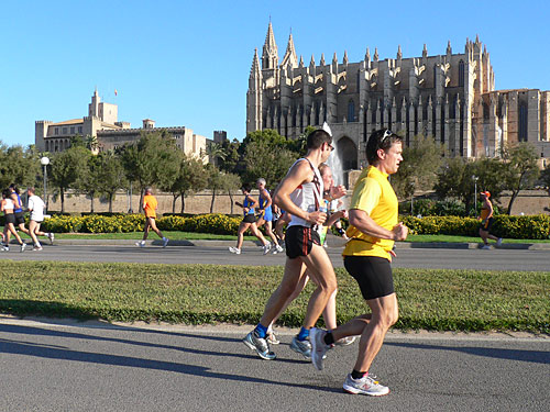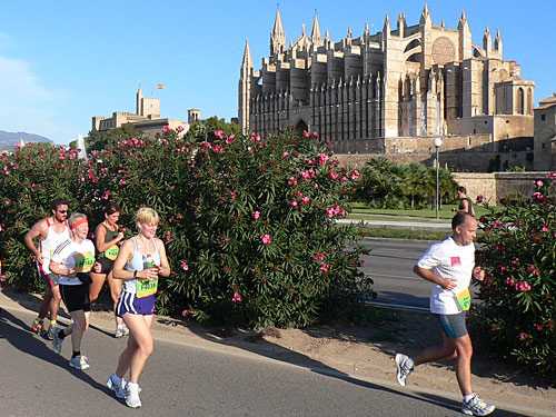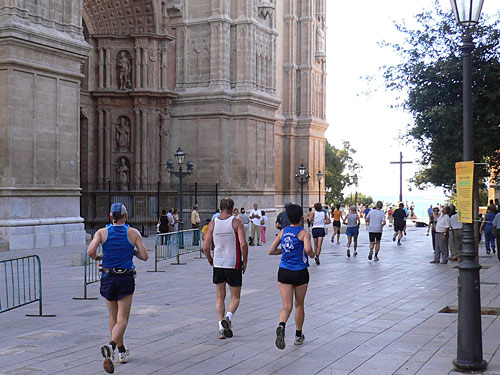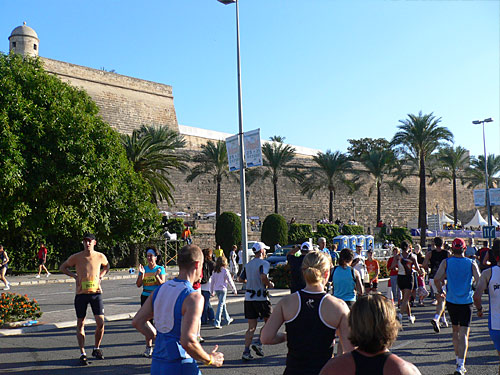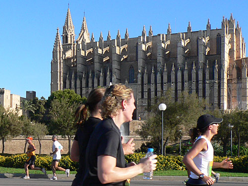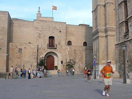 Wir laufen über den Placa Major mit den vielen Cafés, wo uns zahlreiche Zuschauer beklatschen und sehen dann links das historische Rathaus (km 15). Als nächster Höhepunkt wird die Kathedrale passiert. Der Eindruck mit der mächtigen Kirche links, dem Königspalast Almudaina rechts und Ausblick geradeaus auf das Meer ist überwältigend. Viel zu schnell ist man vorbei und wieder in dunklen, kühlen Gassen verschwunden.