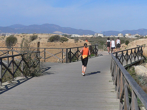 Bei km 34 passieren wir an der inzwischen felsigen Küste die In-Dico “Purobeach“ und gleich darauf verlassen wir die Straße nach links in ein Naturschutzgebiet. Viele Spaziergänger und Radfahrer sind hier unterwegs, aber Probleme gibt es deshalb keine. Den Läufern gibt man heute respektvoll Vorrang.