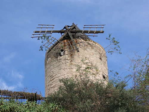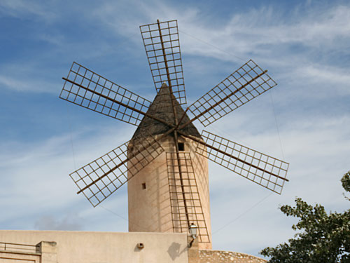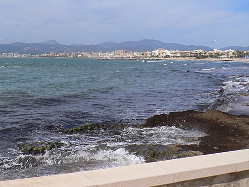 Moderne Appartement- und Wohnanlagen wechseln sich mit Vierteln ab, die offensichtlich mehr von Einheimischen bevorzugt werden. Links sieht man auch mal auf freiem Feld einzelne Bauernhöfe und die für Mallorca typischen Windmühlen.