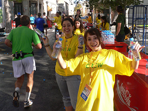 Alle 2,5 bis 3 Kilometer sind Getränke- und Verpflegungsstellen eingerichtet, die oft von jungen Leuten betreut werden, deren gute Laune und Begeisterung auch die ansteckt, die angesichts des Flairs und des herrlichen Wetters nicht schon längst auf Wolken schweben.
