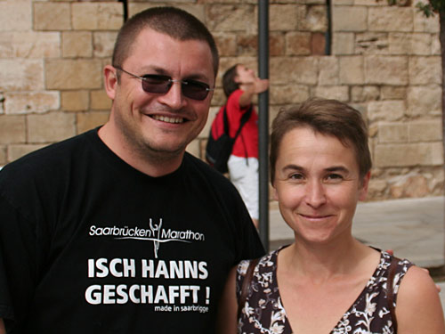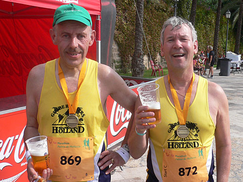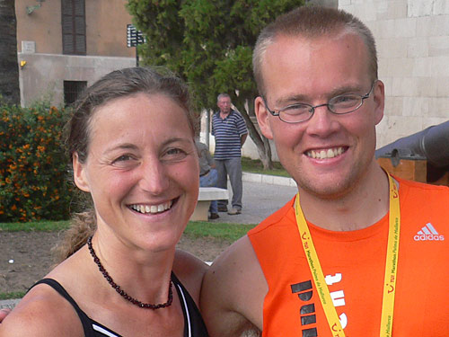 Jetzt treffe ich auch Marc Jörgens und seinen Freund Helmut „Na, wie ist es in diesem Jahr gelaufen?“ „Gut“, antwortet er, „ich habe gewonnen.“ Er strahlt und erzählt mir gleich den ganzen Rennverlauf. Auf der zweiten Hälfte hat auch er schwer gekämpft und gefürchtet, vom Vorjahressieger Ogazon Mari eingeholt zu werden. Dann hat es aber doch mit einer Minute Vorsprung zum ersten Marathonsieg gereicht. Seine 2:35:58 Stunden sind neuer Streckenrekord. Noch einmal herzlichen Glückwunsch.