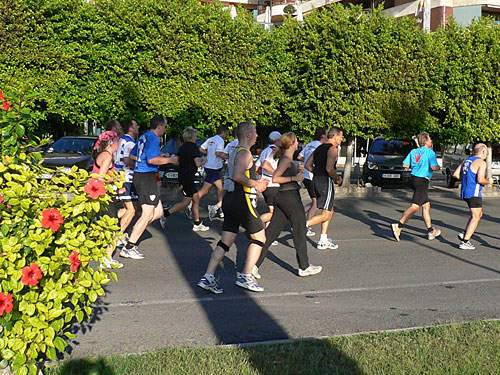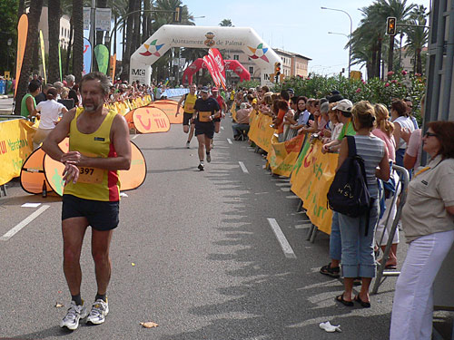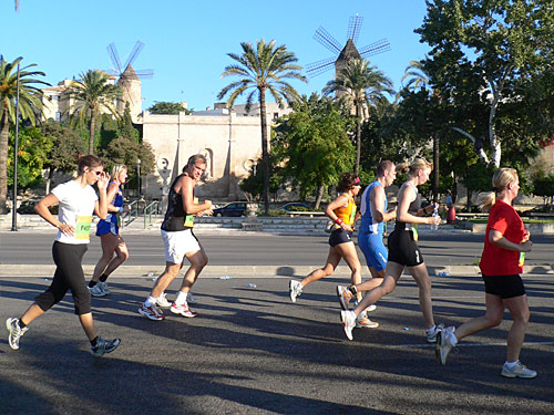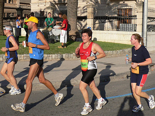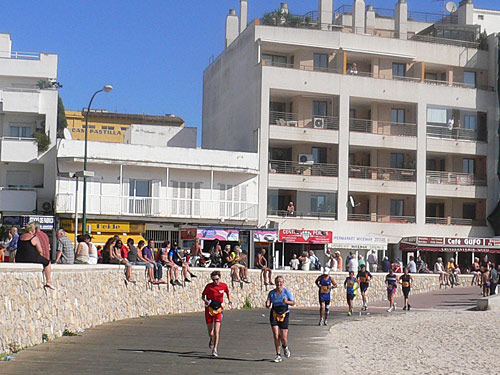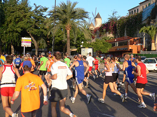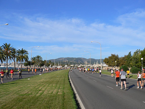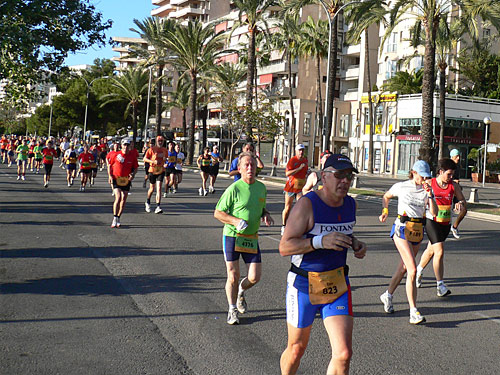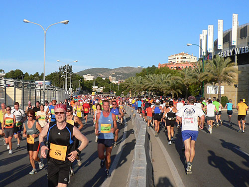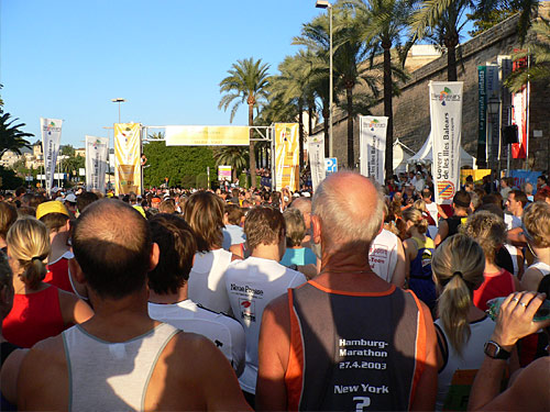 Die Startblocks füllen sich. Marathon und Halbmarathon werden um 9.00 Uhr gestartet, der 10 km-Lauf eine Stunde später. Die Stimmung ist phantastisch. Als Dr. Frenzel den Startschuss abgibt und wir auf einer sieben Kilometer langen Wendepunktstrecke Richtung Porto Pi laufen, passieren wir eine riesige, jubelnde Menschenmenge.