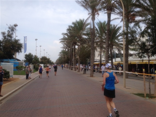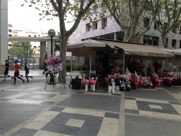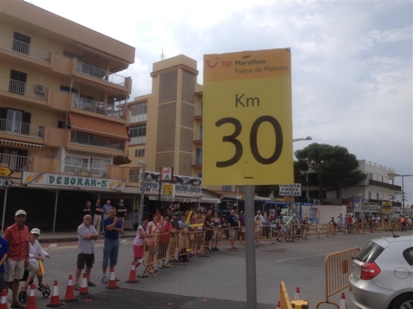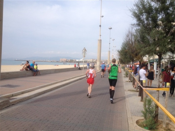 Nach dieser freudigen Überraschung folgen weitere tolle Momente, z.B. über den malerischen Plaza San Francesc, wo ich mich vom ordnungsgemäßen Zustand meines dort im Morgengrauen abgestellten Autos überzeugen kann, durch verwinkelte Gassen, über wunderschöne Höfe und vorbei an nicht minder hübschen Flamenco-Tänzerinnen. So kommen wir schließlich, auf das Meer zulaufend, zu dem Punkt, der die 10 km- bzw. Halbmarathonstrecke vom Marathon trennt. Hier könnte man… Nein, kein Thema, links herum und, die Kathedrale im Rücken lassend, geht es in Richtung Platja de Palma und s’Arenal.