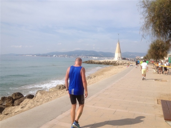 Exakt bei km 30 ist der ostwärtige Wendepunkt erreicht. In der 180°-Kurve stehen viele Zuschauer, zunächst eher verhalten, aber offensichtlich erwartungsfroh. Ich mache den Kasper und erzeuge ohrenbetäubenden Beifall. Na also, geht doch! Tja, jetzt liegt eine lange Schlussgerade von sage und schreibe zwölf km Länge vor uns. Die aber muß uns keine Angst machen, denn Ballermann und s’Arenal versprechen Kurzweil. Allerdings sind wir nicht bis zum berühmten Ballermann Nr. 6 gekommen, es geht erst beim achten vorbei, dann am neunten usw. Ob es daran liegt, wage ich nicht zu behaupten, auf jeden Fall geht es äußerst gesittet zu. Klar, um kurz nach Zwölf liegen die Letzten wohl noch im Delirium, der Rest flaniert auf der Straße, am Strand oder läßt es sich bereits wieder in den Gastronomiebetrieben gut gehen, die wie an der Perlenschnur aufgereiht rechts von uns liegen. Sicherlich ist es alles andere als ein Vergnügen, mit frisch operierter Achillessehne im Krankenhaus zu liegen, aber das kann einen auch vor sich selber schützen. Denn wenn ich mir IHN hier vorstelle bin ich sicher, an akuter Unterhopfung wäre ER bei dem Angebot nicht gescheitert.
