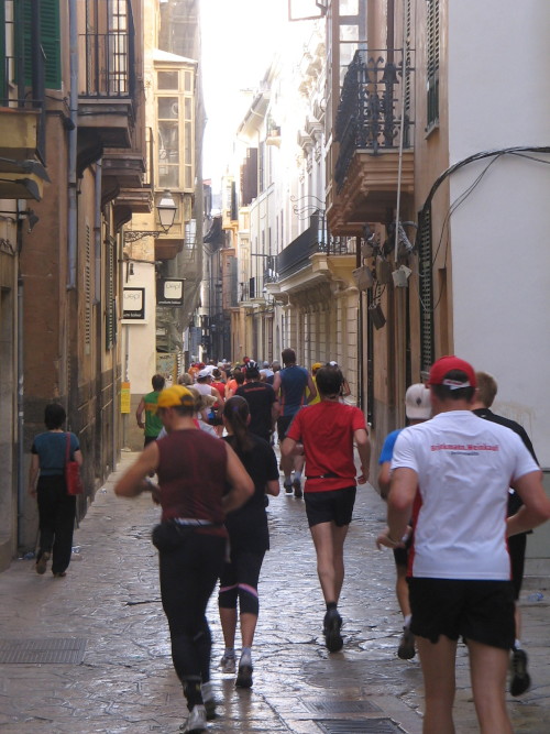 Nach der Comandancia de Marina geht es scharf rechts in die Av. D’Antonio Maura, die uns direkt in die Altstadt hinein führt. Während die 10-km-Läufer hinter uns ins Ziel am Parc de la Mar einlaufen machen wir uns auf den etwa 9 km langen Abschnitt durch die Altstadt von Palma. Die Altstadt mit ihren verwinkelten und oft engen Gassen und Prachtalleen wie Passeig d’es Born, Rambla dels Ducs de Palma, kurz Rambla genannte Einkaufszeile Palmas, gehört für mich zu den Höhepunkten des Laufes.