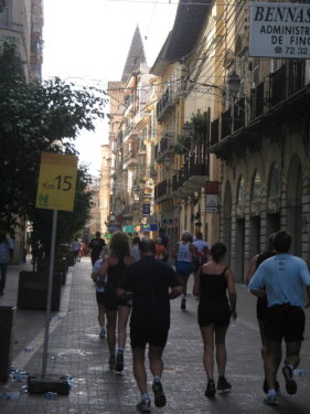 Besonders stimmungsvoll ist die Plaza Major. Dort unterhalten die Kenian Boys – eine afrikanische Akrobatengruppe – Läufer und Zuschauer mit akrobatischen Darbietungen. Wenige Biegungen weiter können wir die Akrobaten ein zweites Mal beim Blick durch die Arkaden bewundern.