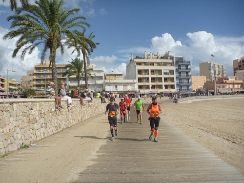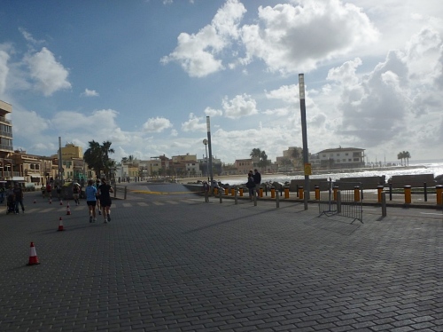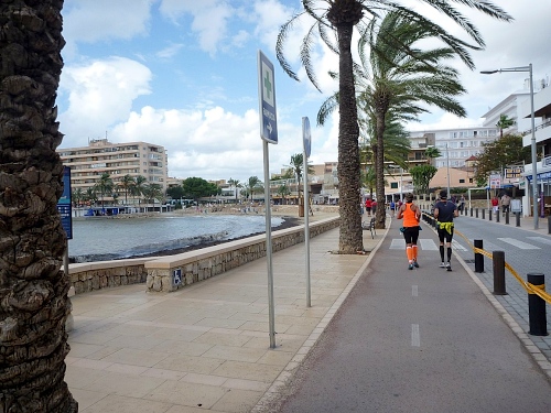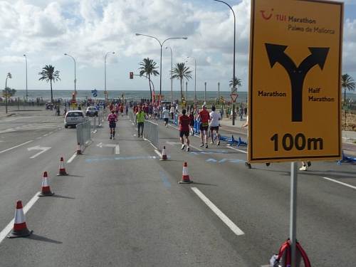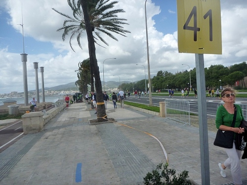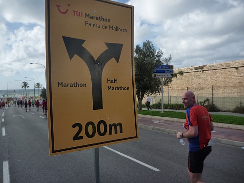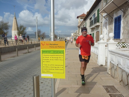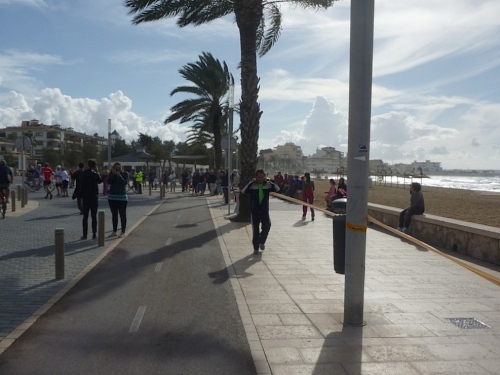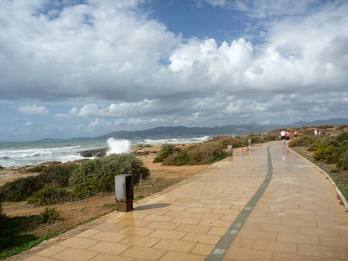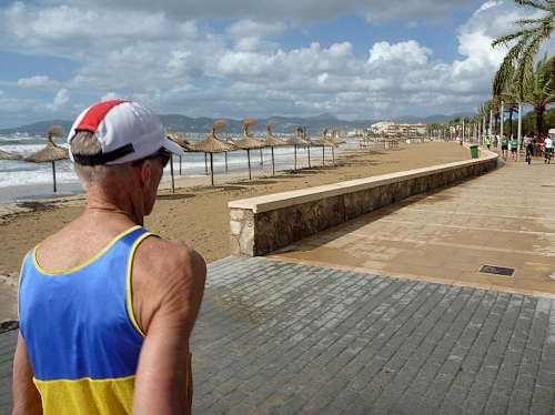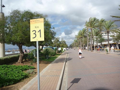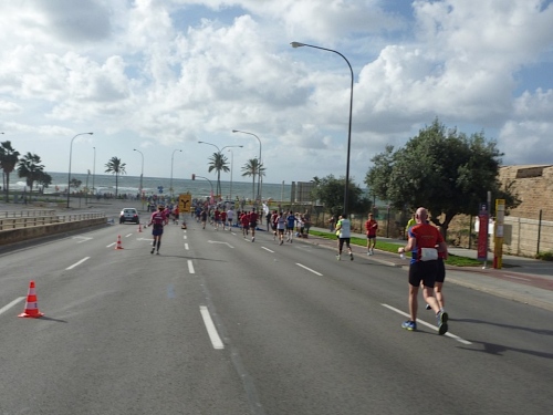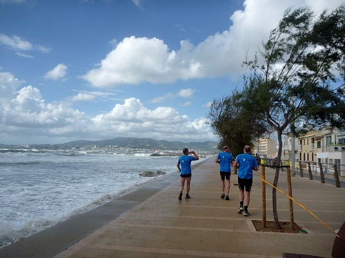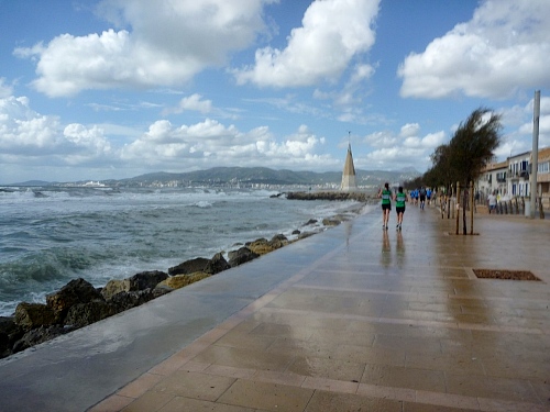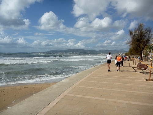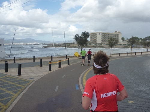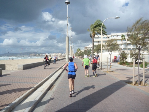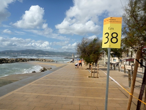 Jochen hat fertig, biegt zum Ziel ab, wir Marathonläufer nach links, nach Westen. Für die nächsten Kilometer ist der herrliche Strand der Bucht von Palma unsere Begleitung. Aber zunächst in der zweiten Reihe. Jeder Marathon muss verdient werden und wie in den Berichten der letzten Jahre erwähnt, stellt dieser Teil entlang der Autobahn zum Flughafen jeden Läufer auf eine harte Probe: „Nur noch drei Kilometer bis zum Ballermann!“ So höre ich von den zwei Läufern des Teams Erdinger Alkoholfrei.