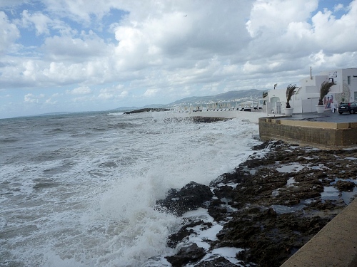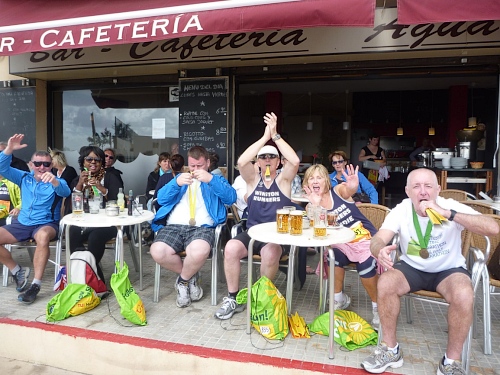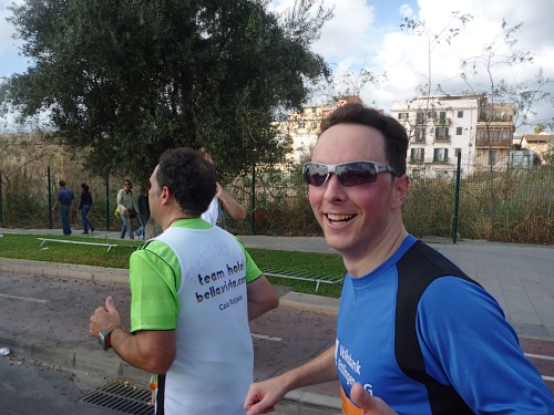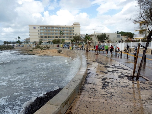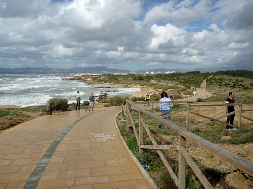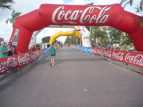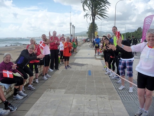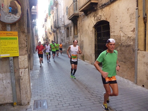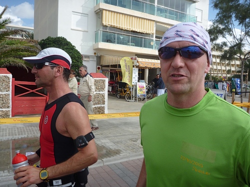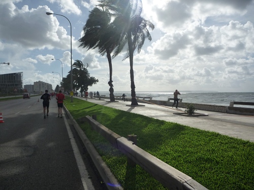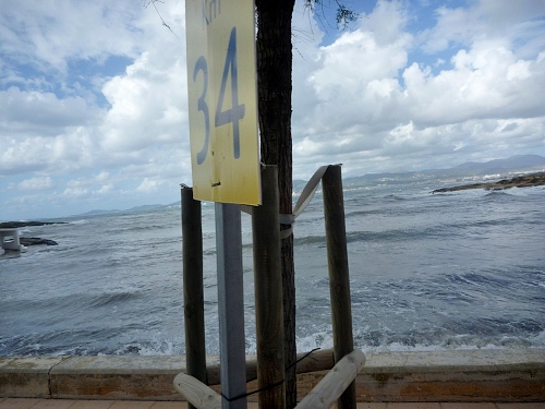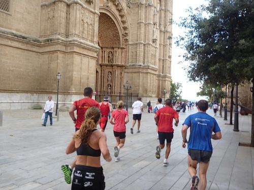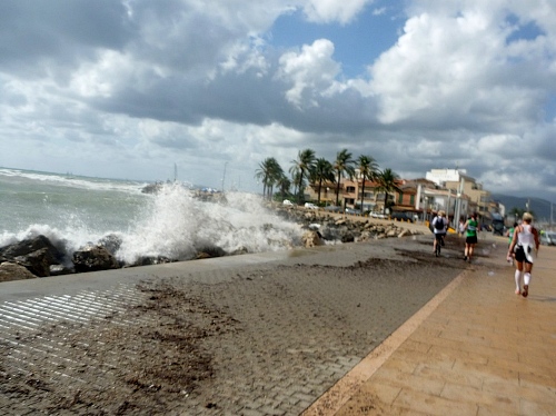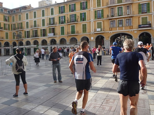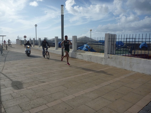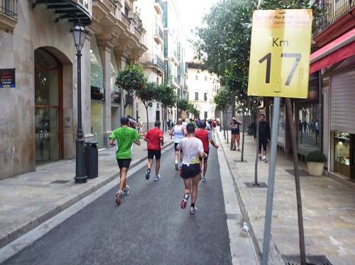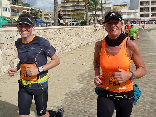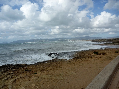 Jochen hat fertig, biegt zum Ziel ab, wir Marathonläufer nach links, nach Westen. Für die nächsten Kilometer ist der herrliche Strand der Bucht von Palma unsere Begleitung. Aber zunächst in der zweiten Reihe. Jeder Marathon muss verdient werden und wie in den Berichten der letzten Jahre erwähnt, stellt dieser Teil entlang der Autobahn zum Flughafen jeden Läufer auf eine harte Probe: „Nur noch drei Kilometer bis zum Ballermann!“ So höre ich von den zwei Läufern des Teams Erdinger Alkoholfrei.