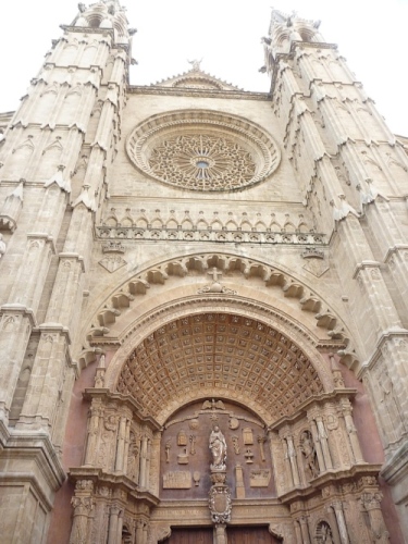 Wir passieren die Westfassade der Kathedrale. 600 Jahre sammelte man Gelder für deren Bau. Die Vorgängerkapelle glich einer Abstellkammer und die verdorrte und verschimmelte Leiche des Sohnes von Jakob dem Eroberer „mit weit geöffnetem Kiefer und großen Augenhöhlen“ diente 500 Jahre lang als Einnahmequelle.