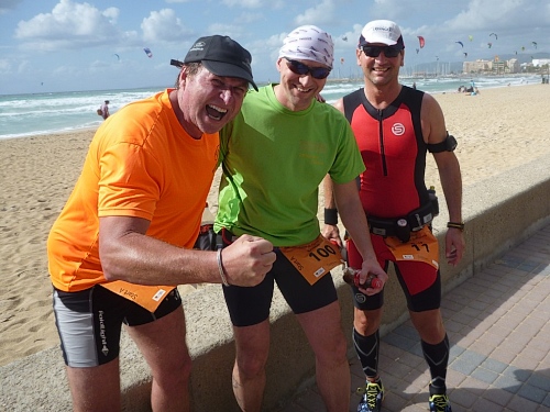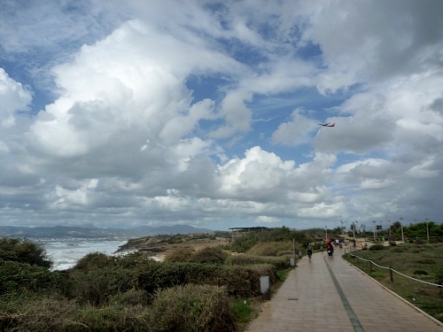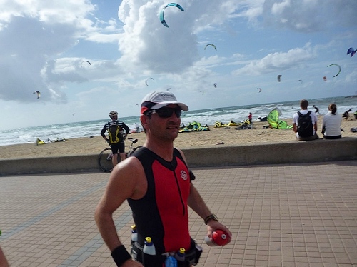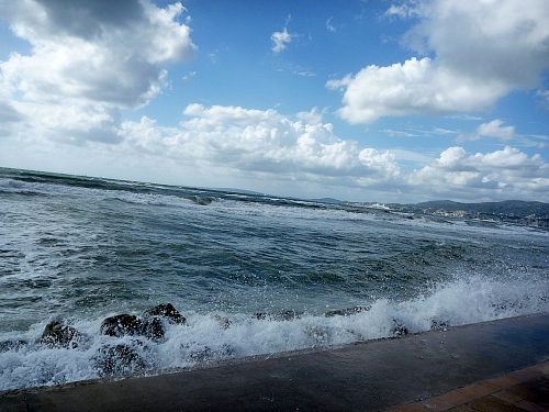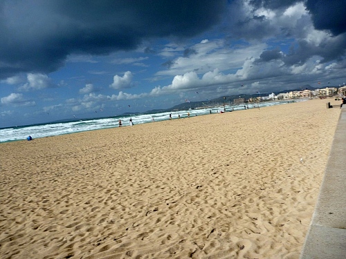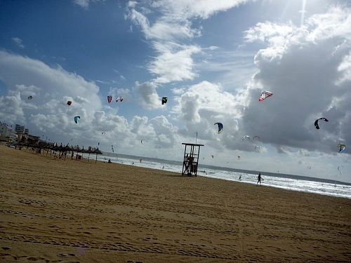 Die Laufstrecke ist genial. Der Wind türmt die Wellen auf, Kitesurfer garnieren mit bunten Segeln den wilden Himmel. Hämisch grinst mich der Kiter an. Ich glaube, er will damit sagen, dass wir die falsche Sportart gewählt haben. Unschuldig halte ich die Handflächen nach oben und zucke mit den Achseln. Er hat vollkommen recht. Da flitzen diese Spinner mit Höllenspeed entlang des Strandes und die querrollenden Wellen reissen die Sportler meterhoch in den Himmel, als wären sie schwerelos. Und wir kämpfen mit schwerem Schritt gegen eben diesen Wind, der uns die salzige Brühe über die Laufschuhe fegt und futtern dazu Bananen.