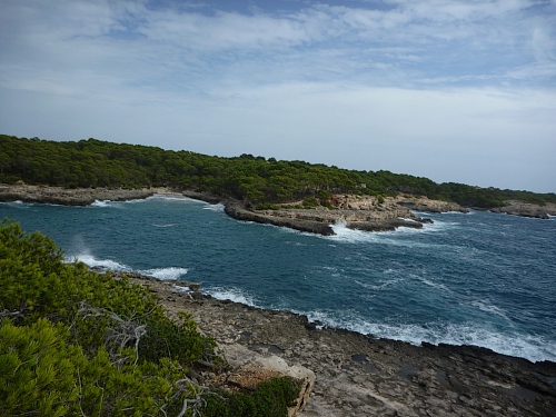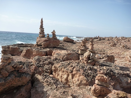Am Cap de ses Salines bauen Touristen kleine Steinsäulen. Irgendjemand fing an, nun gibt es tausende, man will wohl wiederkommen. Verlässt man die Salzseen und fährt an der Küste entlang nach Norden, kommt man bei Santanyi zu diesen einsamen Badebuchten, wo man unter Felsüberhängen wunderbar schnorcheln kann. Die Wassertemperatur hat hier wunderbare 24 Grad.