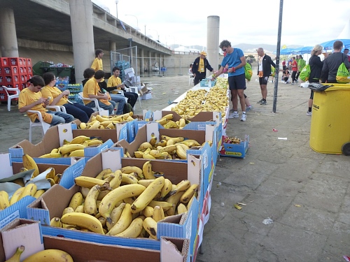 Lustig, wie die gelangweilten „kurzen Helfer“ die kleinen Wasserflaschen hoch in die Luft werfen. Nicht, dass ich irgendwie eine Wasserflasche haben möchte, aber die Idee ist klasse. Ich fange einige auf, der Rest zerplatzt auf dem Pflaster. Plötzlich prasseln die Dinger wie Sternschnuppen auf mich hinab, ich zieh den Kopf ein und ziehe lachend weiter, bis zu der Bar mit den Engländern, die gerade den Halbmarathon absolviert haben. Zwei volle Biergläser auf dem Tisch direkt hier vorne, dazu ausgelassene Begeisterung über uns, die wir den richtigen Marathon laufen. Tja, dann sind die Biergläser auch schon leer. Ich glaube, Engländer waren noch nie so begeistert von einem Deutschen. Greetings from marathon4you dot de.
