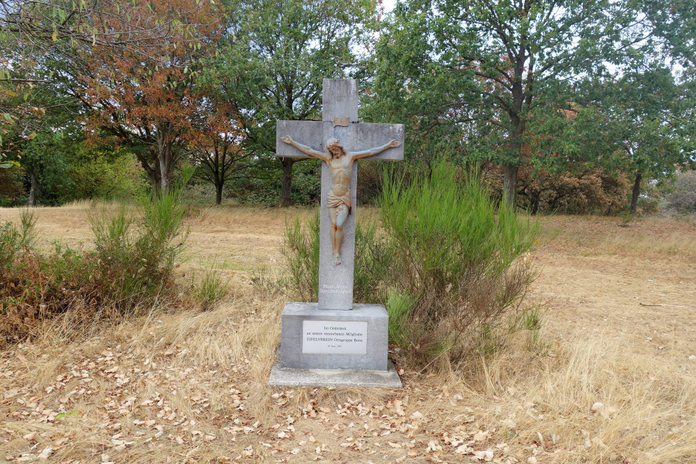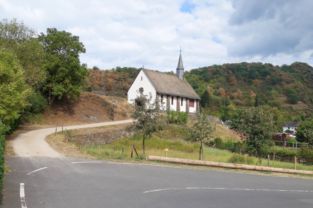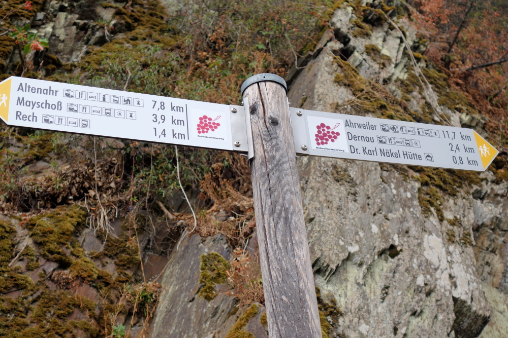 Die Forsterberghütte wird passiert, ein breiter Weg nimmt aus auf. Wieder in den Weinbergen angekommen laufen wir sogar für einige hundert Meter auf Asphalt. Vor uns taucht im Tal Dernau auf. Beim Heiligenhäuschen St. Joseph laufen wir hinab in den Weinort. Vor den ersten Häusern biegen wir rechts ab und weiter geht es auf Asphalt talaufwärts oberhalb des Ortes durch Weinberge.