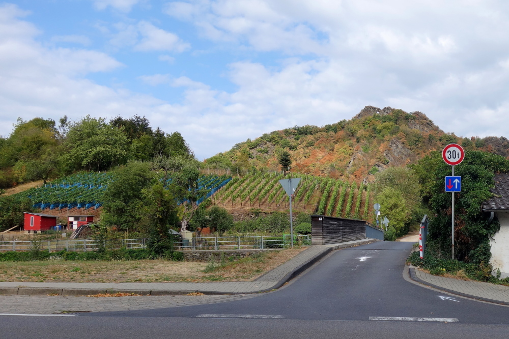 Herrlich so durch die Weinberge zu laufen. Der Blick voraus zeigt endlose Weinberge. Und die roten Trauben sehen Klasse aus. Wird wohl ein guter Jahrgang heuer. Auf der anderen Talseite ist eine weitere imposante Burg zu sehen. Es die Sassenburg, an der wir später noch knapp vorbei laufen werden.