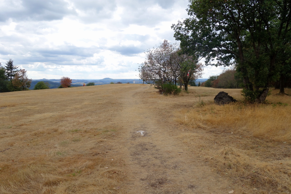 Es geht vorbei an einem Mahnmal für Gefallene der Weltkriege und wir verlassen die Weinberge. Hinein geht es in den Wald. Und das heißt Trailrunning pur. Klasse. Meine Begeisterung steigt. Auf der Höhe angekommen ist die Landschaft offen, statt grün ist alles braun. Die Trockenheit.