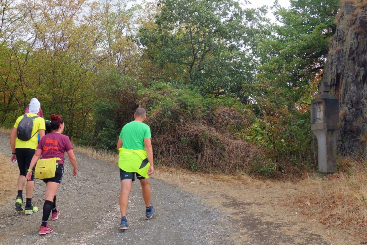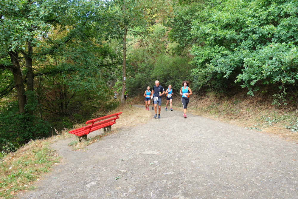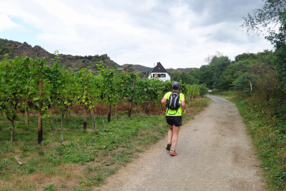 Nach der Aufwärmrunde laufen wir an einigen Häusern vorbei abwärts, überqueren die Straße Rossberg und dann geht es aufwärts den Weinbergen entgegen. Ich treffe Hannelore und wir lassen Erinnerungen an den Wiedtal Ultra Trail aufleben. Gerne hätte ich noch weiter mit ihr geplaudert. Aber sie läuft heute den 33er und ist schneller als ich.