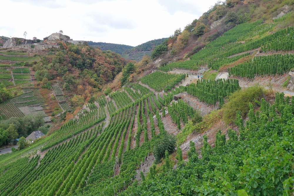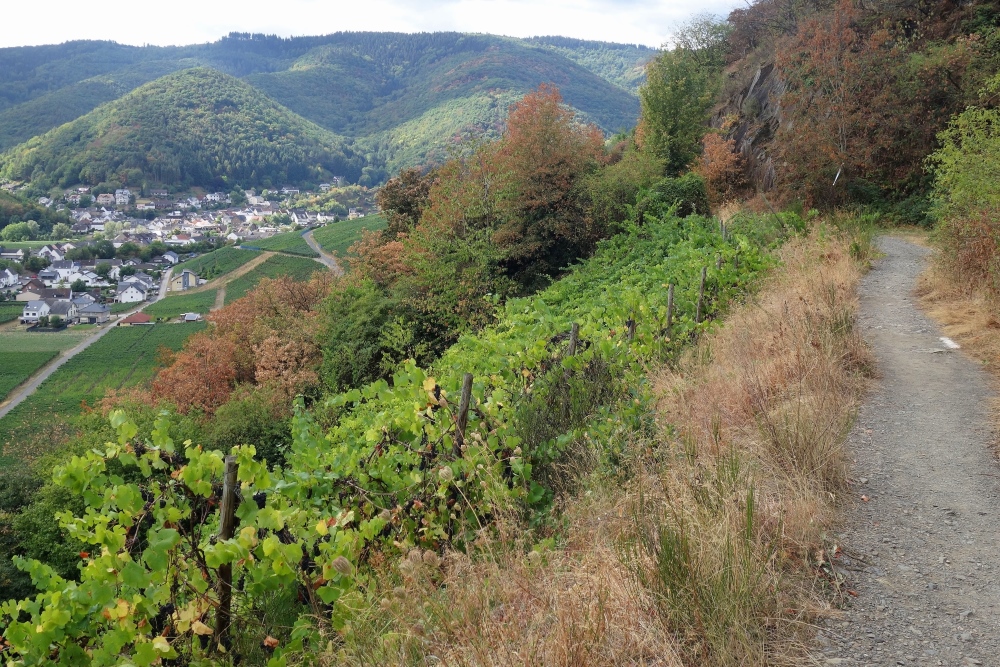 Der Weinbau auf den Trockenmauern in den terrassierten Steillagen im Weinanbaugebiet an der Ahr profitiert davon, dass die Steine die Wärme des Tages speichern und in der Nacht an die Reben abgeben. In der Hauptsache wird Rotwein (Spätburgunder) an der Ahr angebaut, hier im Dernauer Burggarten auch Riesling. Zur Einkehr in eine Straußwirtschaft oder Weinprobe ist aber jetzt keine Zeit. Schade.