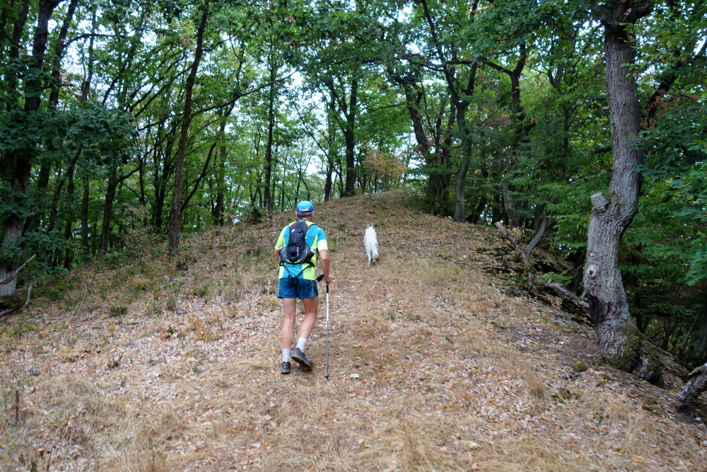 Erst einmal laufen wir leicht abwärts und kommen auf eine Straße am Weinhaus Michaelishof. Die Straße wird gequert und wieder heißt es steigen. Die erste VS kommt. Für Aramis steht eine Schüssel mit Wasser bereit. Für die Zweibeiner gibt es Apfelsaft, Cola, Iso, Wasser, Melone, Kekse, Brote, Riegel, Weingummi …