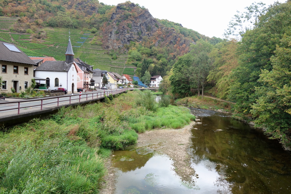 Es ist schön, so zur Abwechslung mal ein längeres Stück an der Ahr zu laufen. Der Fluss hat kaum Wasser. Kein Wunder bei diesem extrem trockenen Sommer. Zwei imposante Brücken werden unterlaufen. Links vor uns liegen aufgelassene Weinberge. Die Terrassen sind noch gut zu erkennen.