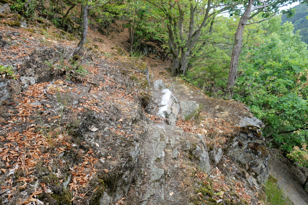 Die vor uns liegende Runde hat es in sich. Zunächst laufen wir der Bahn entlang, dann über breite Eisenstege. An einem kurzen Eisenbahntunnel heißt es für uns steigen. Aber wie. Scheinbar endlos geht es in schmalen Serpentinen aufwärts. Ein Genuss trotz der Anstrengung. Vis-a-vis thront eine Burgruine auf einem Felsen.