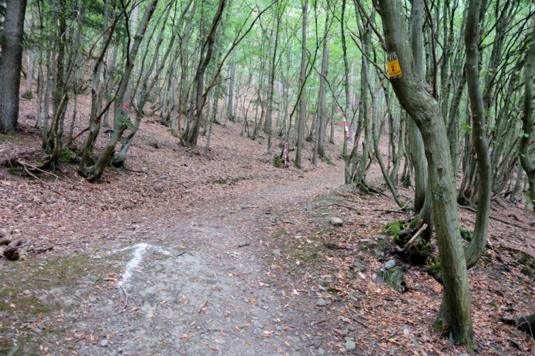 Die Strecke bleibt sehr abwechslungsreich. Schmale Trails wechseln sich mit breiten Forstwegen ab. Ein Bachbett ohne Wasser wird überquert. Und es heißt mal wieder lange, lange steigen. Puh, da merke ich meine Defizite. Aber ich kämpfe und mache Schritt für Schritt aufwärts.