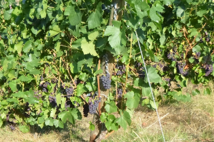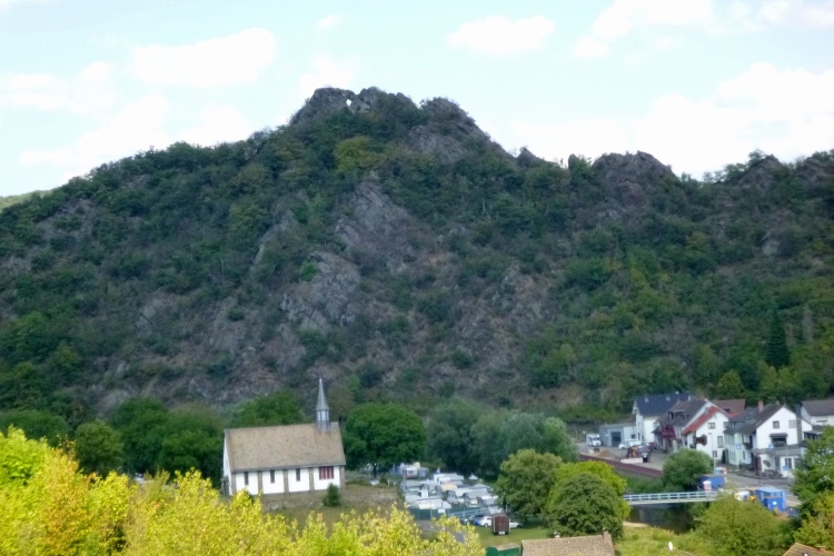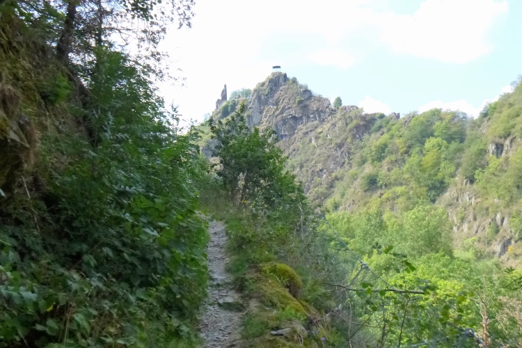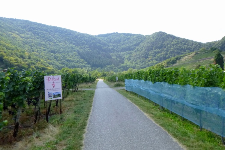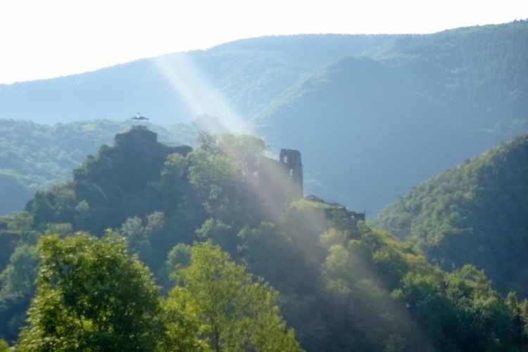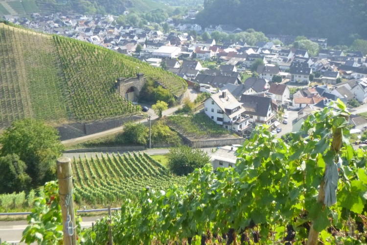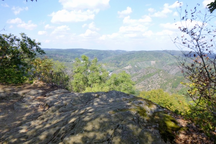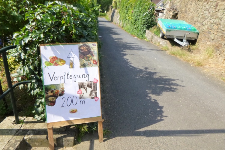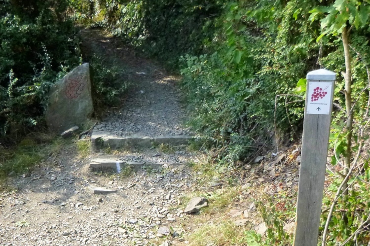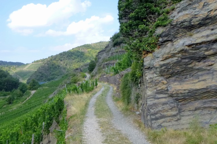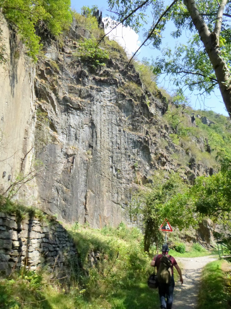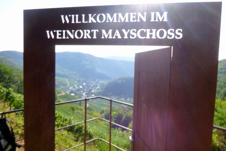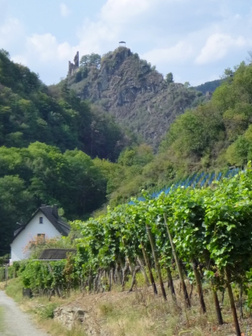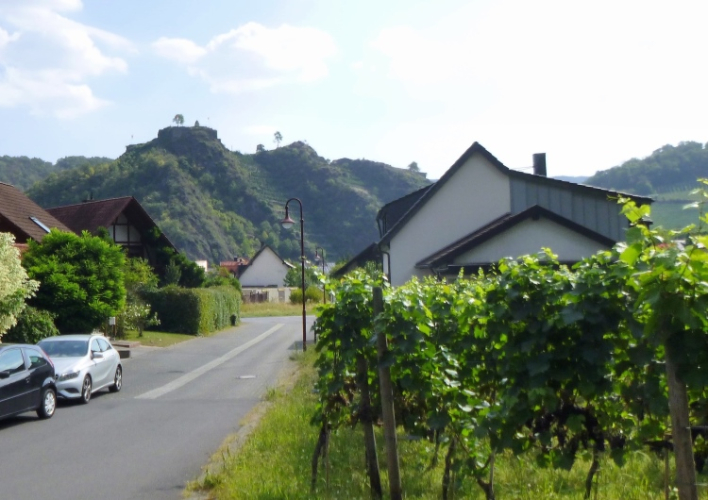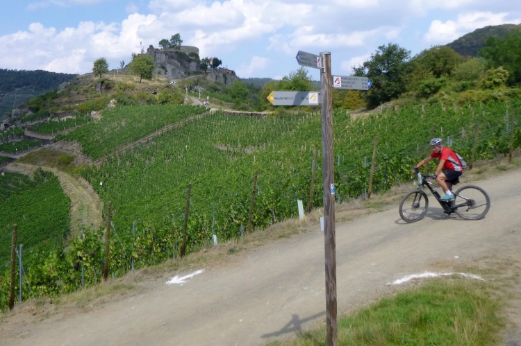 Bis denn der erste Anstieg kommt. Fröhliches, beschwingtes Schweigen breitet sich aus, je höher wir kommen. So bei 20° und im Schatten der Bäume ist das ganz ok. Eule hat weiße Pfeile verlegt, an den Streckentrennungen gibt’s große Tafeln. Kein Vertun also. Einfach den Pfeilen nach und man kommt in und oberhalb der Weinberg- Südhänge an Stellen mit phantastischer Aussicht an: Burgruinen auf den Berggipfeln, im Tal die kleinen Weinorte. Hinweistafeln begrüßen uns an den besonderen Stellen, denn hier wird auch der Rotweinwanderweg gerne genutzt. Leider ist das mit dem Ausschank nicht soo toll, das muss also warten.