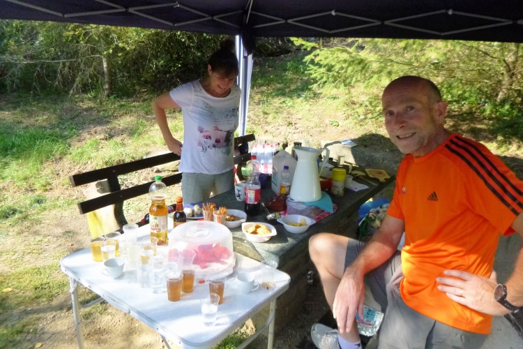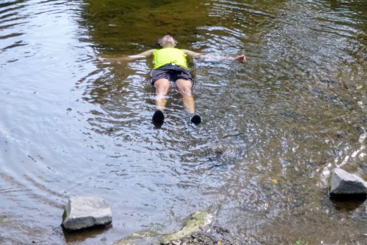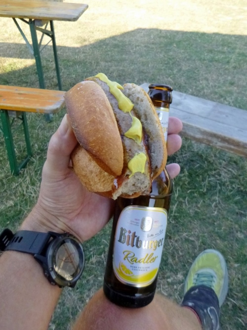 Zurück zur Brücke und dem Radweg am Fluss gefolgt. Irgendwie geht es einfacher jetzt. Der letzte VP mit Vollverpflegung und Zugang zum Fluss - ein Kollege legt sich gleich mal rein. Als er ins Ziel kommt, ist er schon längst wieder trocken…