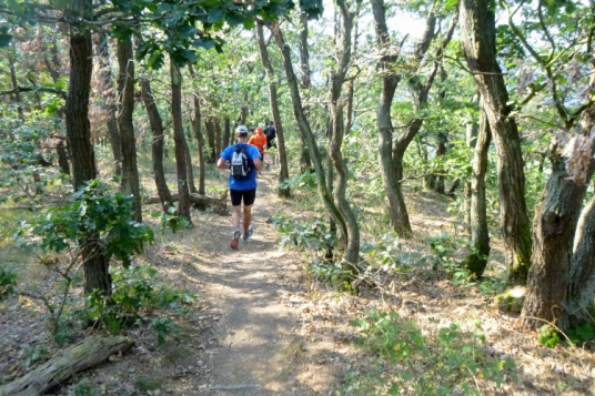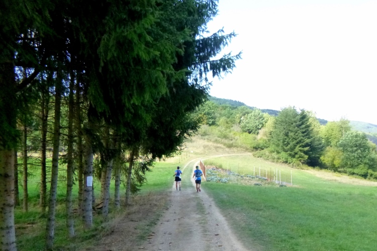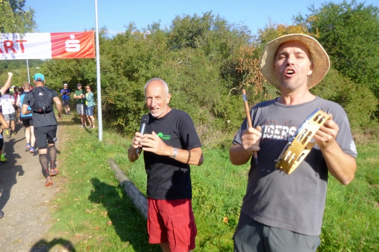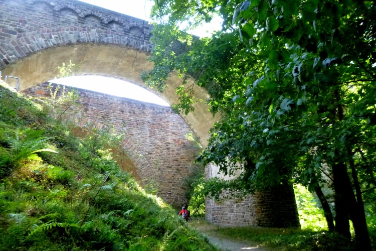 Zwei große Eisenbahnviadukte werden unterquert, eines wird noch benutzt. Und nun wieder, für alle Strecken, im Wald hoch, so richtig schön steil. Wenige können das laufen. Erstmal etwas Trail, dann Forstweg. Nach oben, VP 5 mit Erfrischungen bewacht die Streckentrennung.