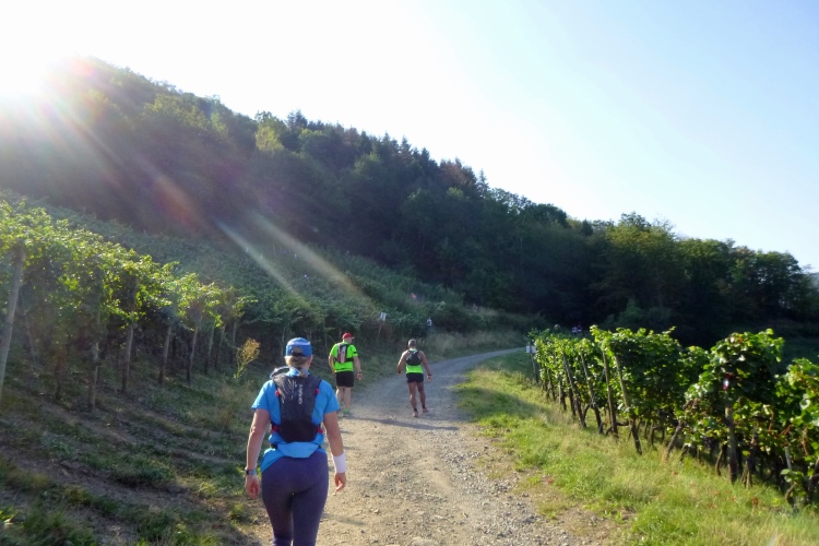 Auf breiten Waldwegen, Fahrwegen der Winzer und auf Singletrails erreichen wir Dernau. Umkehrpunkt und weiter unten am Berg wieder zurück. Nur: alles ohne Schatten. So hoch wuchern die Reben auch wieder nicht. Lorenz da oben ist ein ordentliches Stück höher gestiegen und erwischt uns nun ziemlich direkt. Das ist nicht so meins, nimmt mir die Laufpower aus den Beinen. In Schattenpassagen geht’s dann wieder, dafür reguliert dann die Steilheit das Tempo runter. Und da ist so einiges an Steilheit. Zum VP 1/2 ist es ja noch ganz gut, aber kurz danach wird’s mörderisch. Gut, im Busch ist Schatten. Dafür ist aber die Temperatur inzwischen kräftig gestiegen. Oben schließt sich die erste Schleife, hier waren wir bereits und biegen ins Ahrtal ab. Runter vom Berg, über den Fluss zum VP3 bei etwa 21 km.
