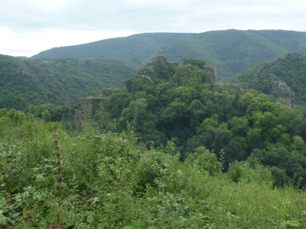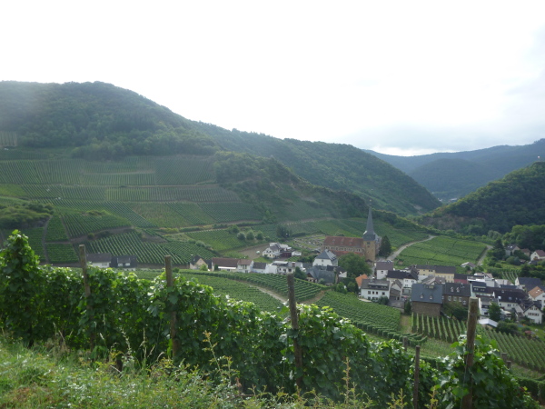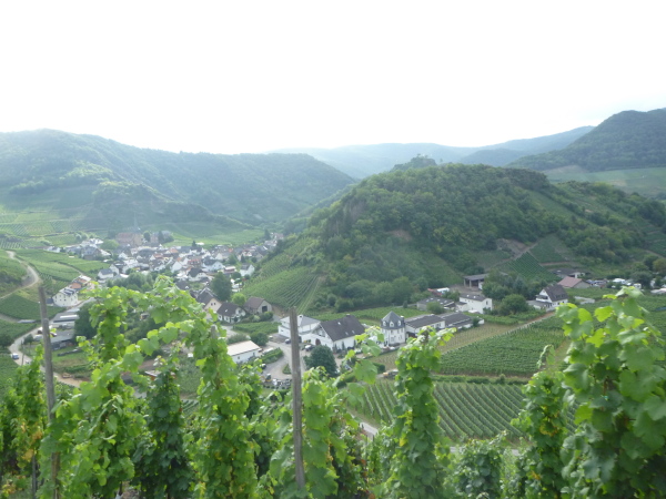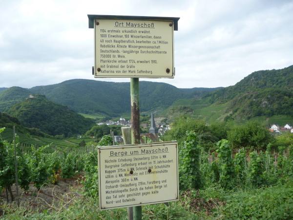 Km 6 Mayschoß liegt in einem Talkessel der Ahr (keltisch=Wasser), mittendrin ein sogenannter Umlaufberg, der Etzhardt, ein Block, den die Ahr nicht schaffte. Die Felsen entstanden im Devon. Direkt am 180 Jahre alten Straßentunnel in Altenahr kann man das Furchenmuster des Wattgebietes erkennen, was sich hier vor 400 Mio Jahren ausdehnte. An Fossilien gibt es wenig, ein paar Muscheln, Brachiopoden und Haarsterne. Solche Blöcke, die die Ahr nicht schaffte, haben Quarzitadern, die durch eindringendes Wasser gebildet wurden. Darin auch Spuren von Edelmetallen, aber Gold-, Silber-und Bronzeauszeichnungen verdient man in den Weinbergen. Die Trauben, die mit blauen Netzen abgedeckt sind, ergeben in einigen Monaten den Eiswein.