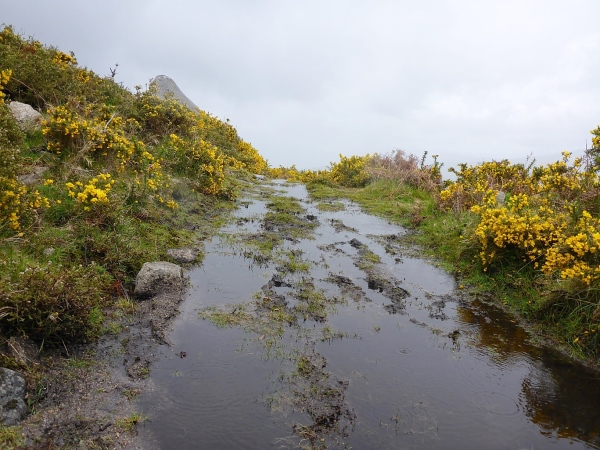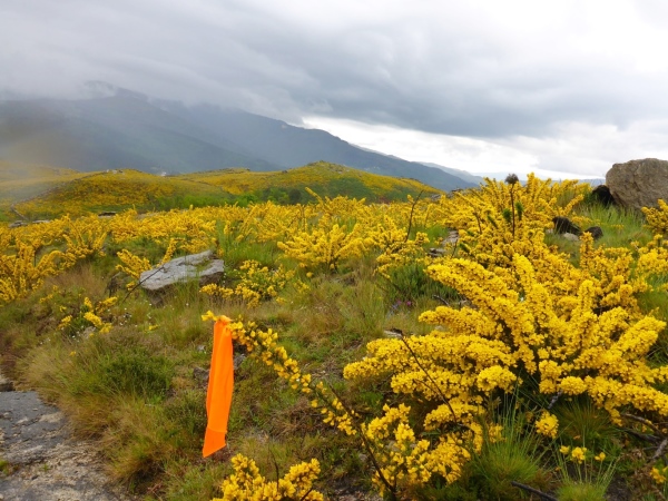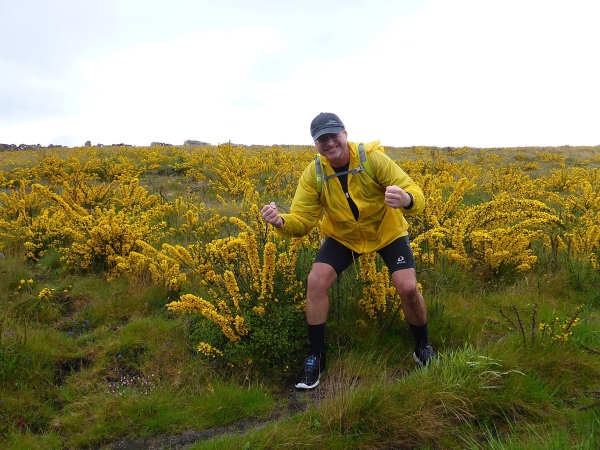 Hochmoor ist eigentlich etwas anderes, hier gibt es Heidekraut mit Suppe untendrunter, viel Suppe. Hier zu laufen, bereitet mir Schmerzen, denn ich weiss, dass dies ein empfindliches Ökosystem ist, dass Tier und Pflanze hart kämpfen müssen, um sich in der kurzen Warmzeit aufzubauen. Mit jedem Schritt zerquetsche ich fünf, sechs Kaulquappen, Futter für Brüder und Schwestern. Oft, sehr oft wird für uns wenige Läufer ein Pfad durch die Pflanzenwelt gemäht. Wir sind Pioniere, nach uns wird dieser Trailverlauf von der Parkverwaltung markiert und als Wanderweg ausgewiesen werden. Oft bleibe ich stehen, mache Selfies von mir, ganz in gelb und der gelben Ginsterlandschaft. Der Ginster ist fies, die Stacheln bleiben in den Schienbeinen stecken, die beginnen zu eitern. Jeden Tag werden wir fünf, sechs namenlose Pässe überqueren, hoch, runter, hoch runter.