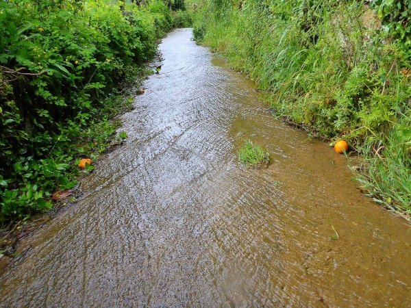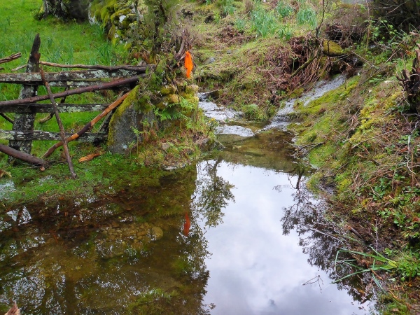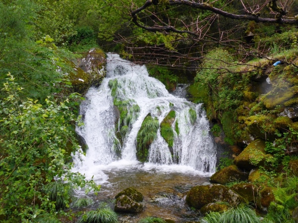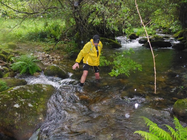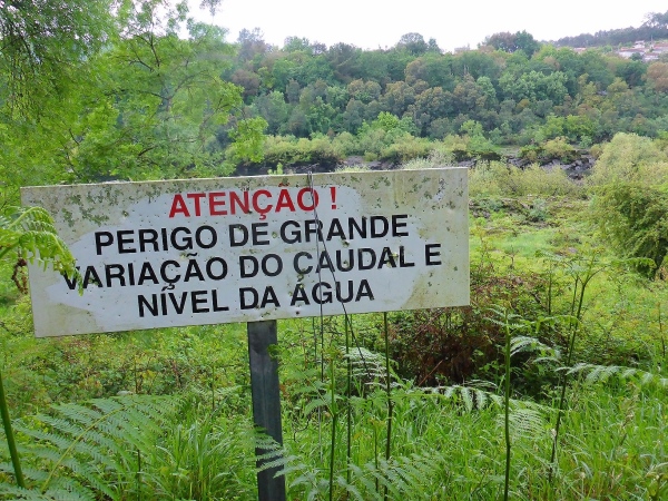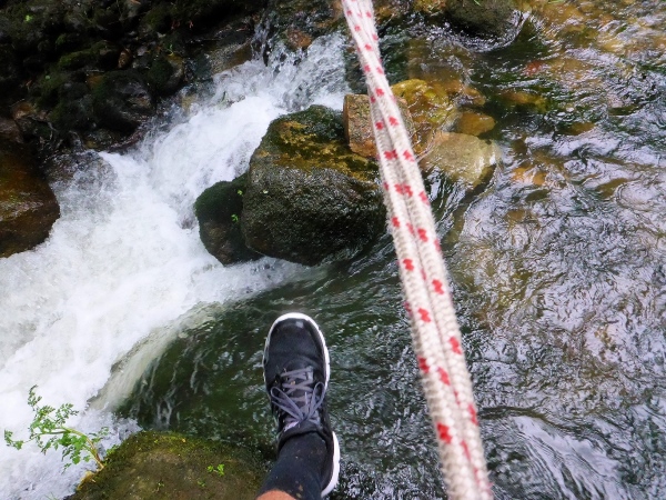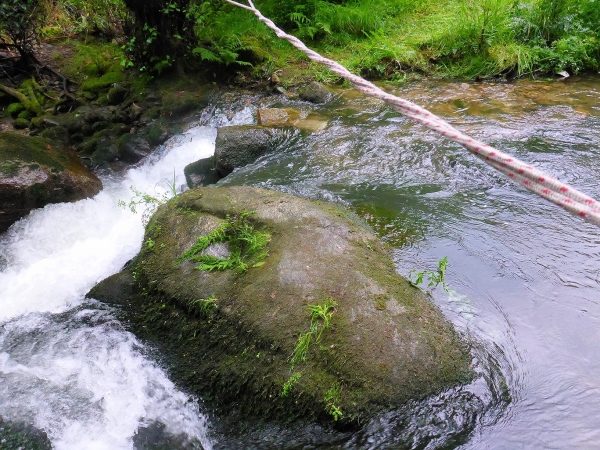 Das Wasser ist drohend schwarz, die großen Schilder warnen eindeutig. Glücklicherweise biegen wir in ein langes Tal ab. Links ist ein Abgrund, der jedem von uns das Läuferblut gefrieren lässt. Vor einer alten Mühle ist ein Seil über den Fluss gespannt. Am zweiten Tag ist diese Flussdurchquerung noch ein respektables Hindernis. Jetzt wo ich diese Zeilen schreibe, nur noch eine Erwähnung wert, weil ich ein Foto geschossen habe.