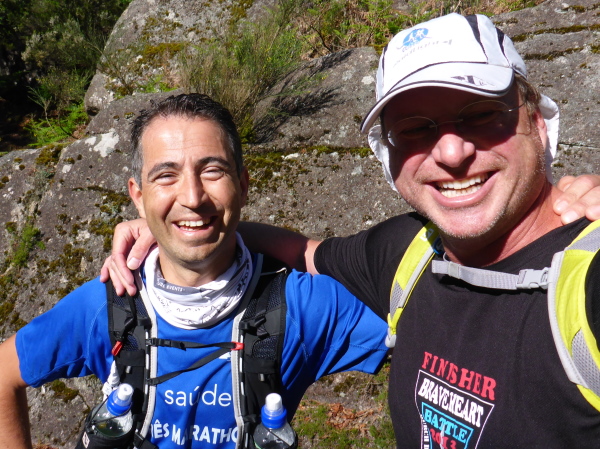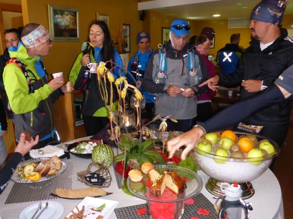 Zum Abendessen gibt es Schnitzel, die guten, die von den hier lebenden Ferkeln, mit viel Knoblauch, dazu Schwertfischsteaks, die mir auf der Zunge zerfallen. Carlos Sá sitzt mir gegenüber. Ich lobe seinen Trail (auf spanisch), dass ihm (ungelogen!) die Tränen in die Augen kommen. Es gibt niemanden hier, der nach Pflanzenkost ruft, alle spachteln die fetten, knusprigen Steaks. Der Wein fließt so reichlich, dass selbst ich verwundert bin. Carlos, der heute Nacht wieder hinausläuft, um die Markierungen zu setzen, nimmt nicht die Hand von der Weinflasche. Mit der anderen drückt er mich. An diesem Abend sind wir alle feste Freunde geworden.