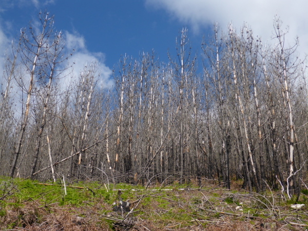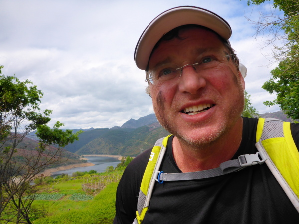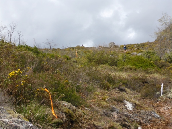 Ich habe Misst gemacht, großen Mist. Ich weiss, dass der Abmarkierer, der Mauro, meinen Rückweg ins irdische Dasein unmöglich macht, wenn er vor mir ist. Also laufe ich um mein Leben, den Berg wieder hinauf. GPS. Glück. Kraft und Überlebenswille, dann bin ich nach 2 Stunden wieder auf Kurs. An einem verbrannten Hang bemühe ich mich, Anschluß an die Welt zu finden. Ich erreiche Mauro, den ich wild umarme.