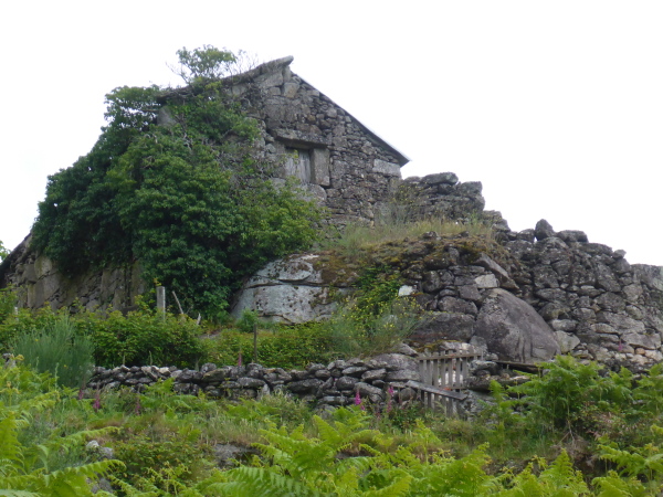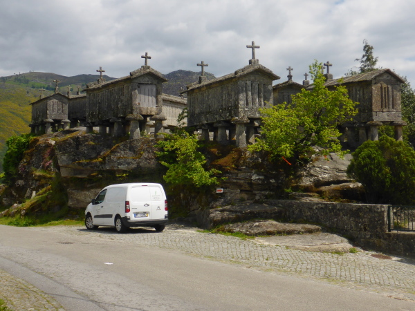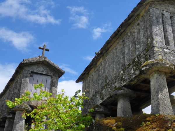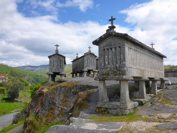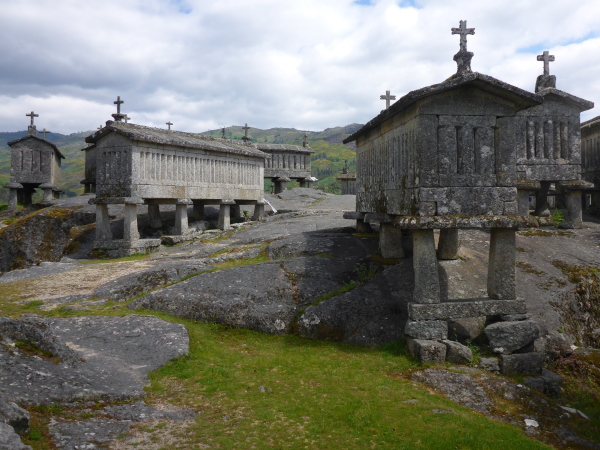 Auf der erhöhnten, gemeinschaftlichen Tenne, die von großen Granitblöcken überragt wird, stehen 24 spätmittelalterlichen Kornspeicher (Espigueiros), die wie überdimensionierte Monstersärge auf Stelzen aussehen. Die Kreuze auf den Dächern betonen die Gruftartigkeit dieser Komplexe, jedoch bitten sie um göttlichen Schutz für den im Inneren gelagerten Mais.