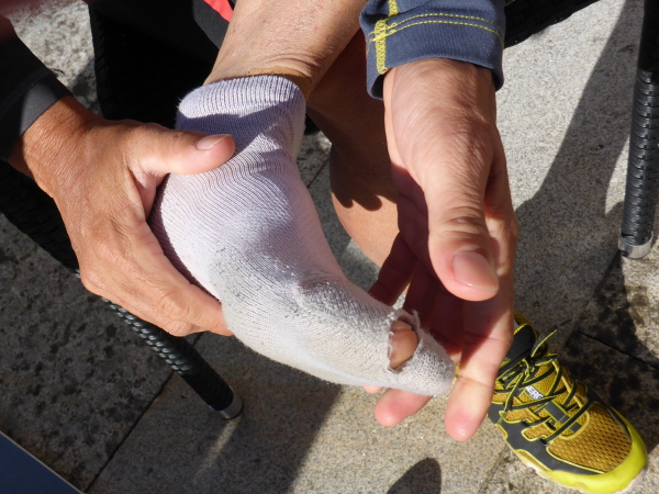 Den Startzeitpunkt vor der wunderschönen Bergkirche bestimmen die Läufer, die sich irgendwann auf irgendein gefühltes Kommando hin von den Stühlen der Cafés erheben und wie Zombies Richtung Bogen wackeln. Manchmal wird nachgezählt, ob alle beisammen sind. Alle? Es werden täglich weniger! Nary hilft Salva, die Holzsplitter aus dem Oberschenkel zu quetschen. Ein Chingeling hat dicke Löcher in den Socken, meine liegen auf der Heizung, die Dinger kann man eh niemandem mehr anbieten!