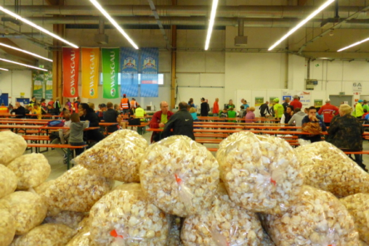 Man machte aus den Uniformen nun Schuhe. Es entstanden Fabriken und ein Messegelände, auf dem man die Schuhe verkaufte. Vielleicht schrie man damals schon vor Glück. Heute werden auf diesem Gelände Laufschuhe, Gels, Getränke, Frühstück, Popcorn und Laufreisen verkauft. Und die Startnummern für den Marathon ausgegeben.
