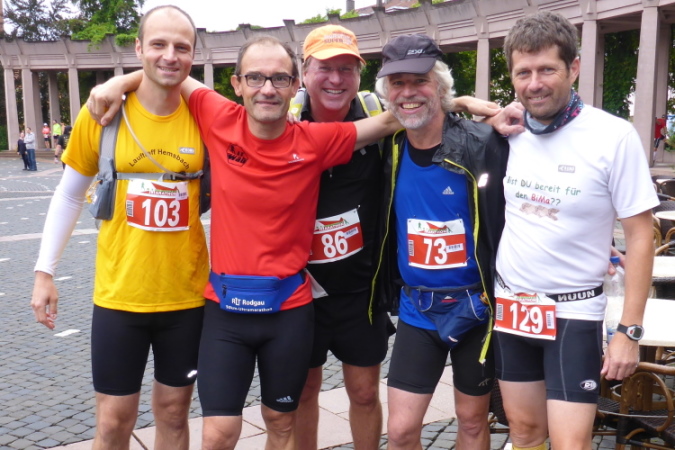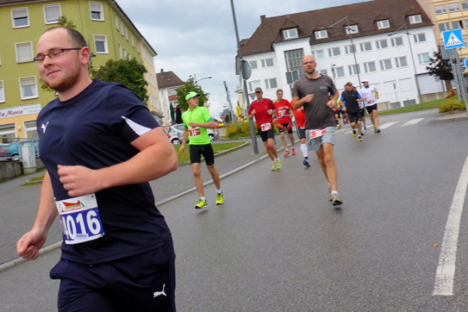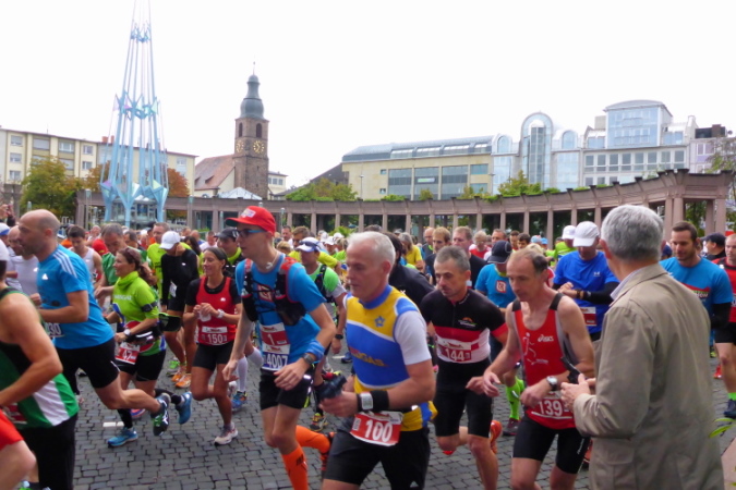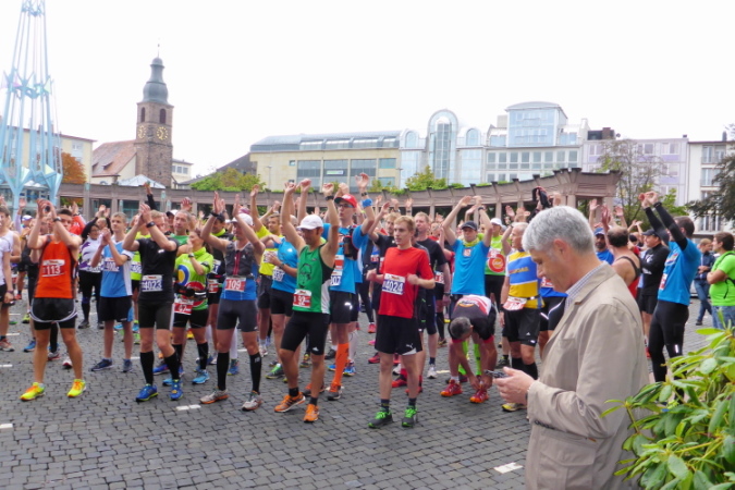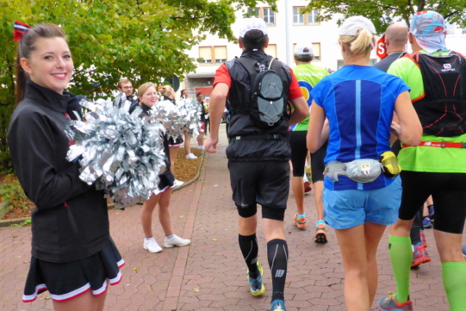 Den Startschuß gibt der Bürgermeister um 10:30 am Exerzierplatz. Kein Starttor, keine Zeitmessmatte, die Einfachheit garantiert preisgünstiges Startgeld (18-28), ohne dass die Qualität leidet. Das Führungsfahrzeug bringt uns über die alte Salzstrasse, heute Schloß- und Alleestrasse, die wir nach Osten überqueren. Das Salz kam aus dem lothringischen Salzgau (Saulnois).