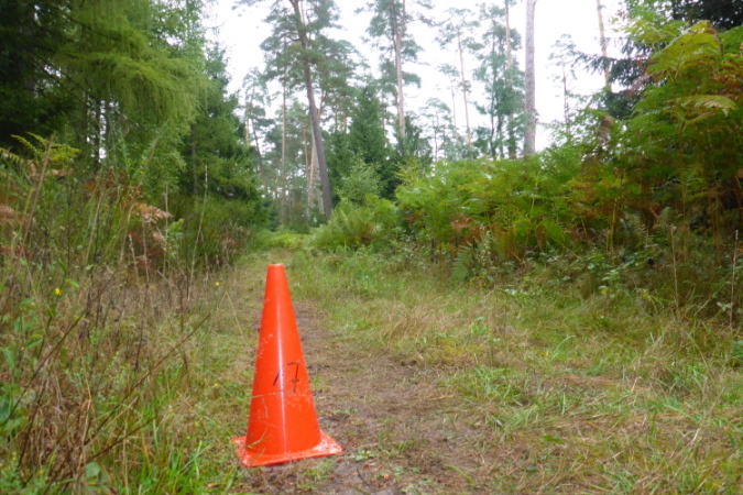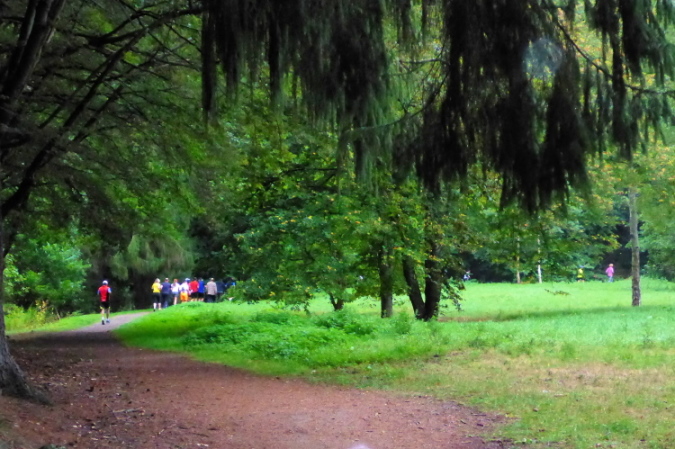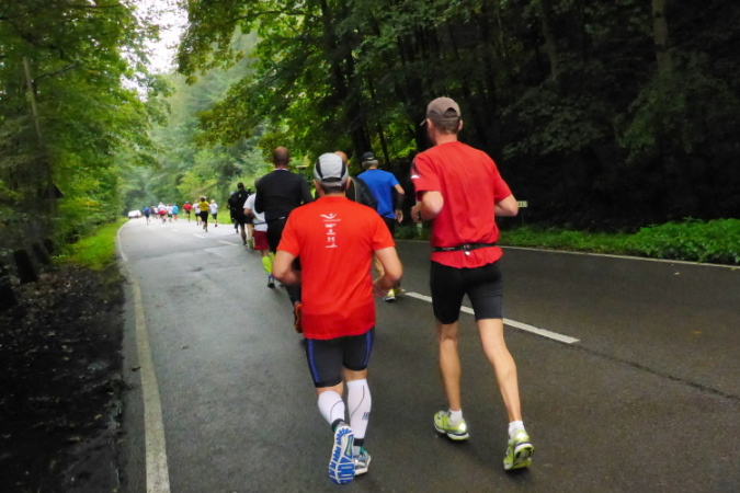 Eigentlich ist die Laufstrecke gut abgesperrt. Ich laufe erstmal im Kreis, wahrscheinlich um zu sehen, wie schnell der Bierausschank in der Gaststätte erfolgen könnte, denn ich komme ja wieder. Für Marathonläufer beginnt nun eine 8 km Schleife. Das Gras auf dem Weg ist eindeutig niedergetrampelt, Läufer sehe ich jedoch nicht, wahrscheinlich laufe ich entgegen der Laufrichtung.