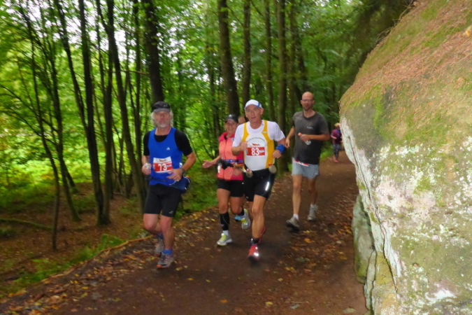 Zahllose Felsentrails führen nun zur Bärenhöhle, der Bärenquelle, der keltischen Burg, den Brudersteinen, den Amboßfelsen und sonstigen Urgesteinen. Für diesen Marathon sind aber nur 650 Höhenmeter vorgesehen, deswegen geht es nicht dort hinauf. Alle Steigungen sind gut laufbar. Ich gebe mir heute Mühe, mache keine Pausen, schon gar nicht für Fotos, denn zu sehen gibt es: Jawoll, nichts! Dafür sind die VP´s super ausgestattet. Ich könnte jetzt eine Banane, einen Musliriegel, oder einen Apfel fotografieren (manche kennen die Dinger ja nicht), aber so habe ich damals auch laufen gelernt: wir hatten ja nix.