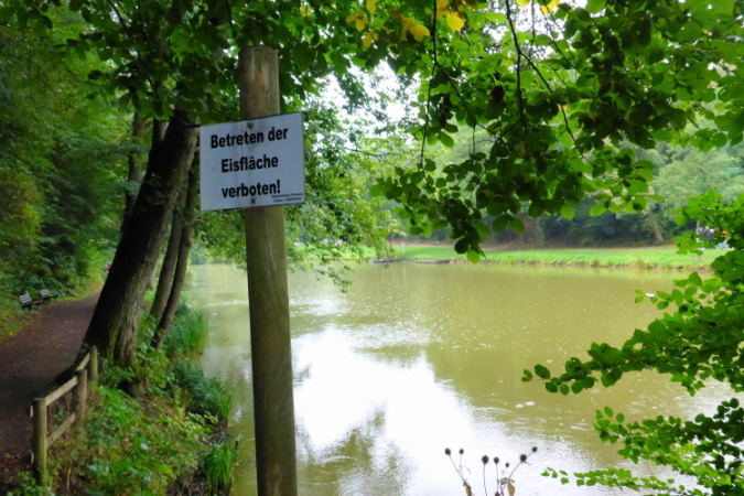 An der grün-düsternen Laufstrecke begrüßen uns die ersten moosigen Sandsteinformationen. Der Kugelfelsen gibt bei der stetigen Erosion des Sandsteinfelsens kugelrunde Kieselsteine frei. Der Sandstein entstand im Perm, vor 280 Millionen Jahre, als die Pfalz eine Wüste war. Im Eisweiher wurde Eis für die Brauerein gestochen, das man für den Sommer in den Sandsteinhöhlen lagerte. Am See nehme ich einen letzten Lichtblick.