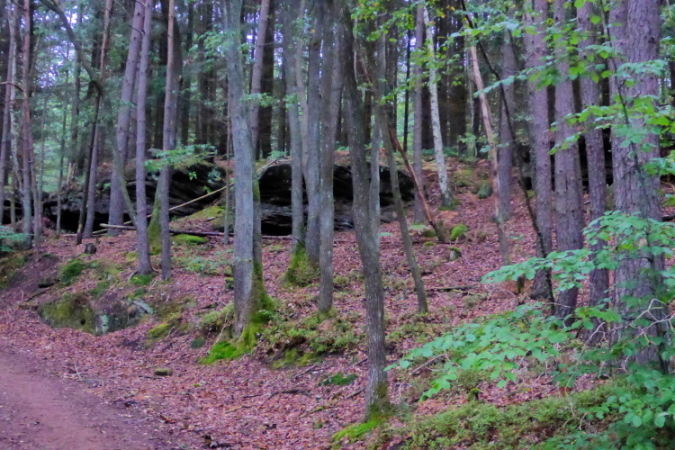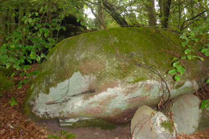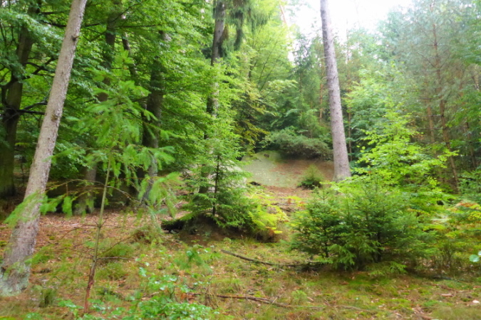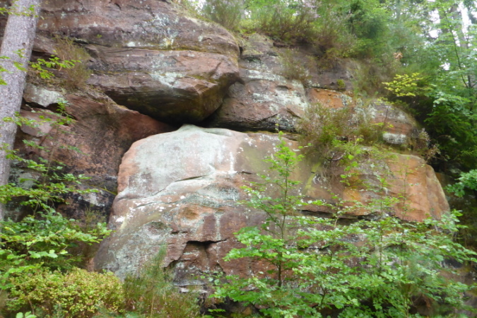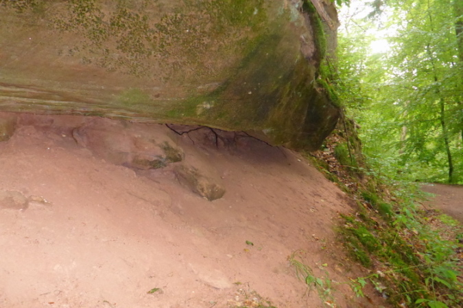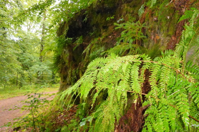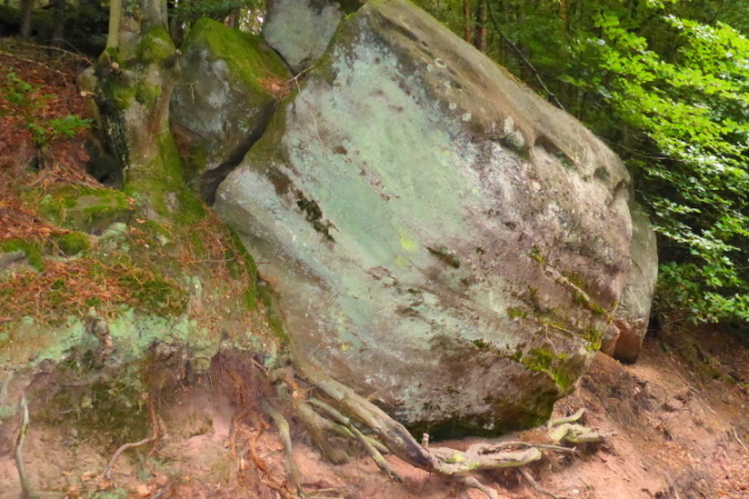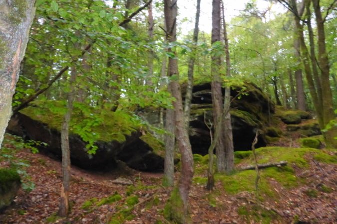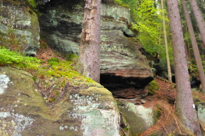 Zu sehen gibt es ab sofort: Nichts! Wer jedoch genau hinschaut, kann Bäume, Moose, Farne, und alte Schitzereien in Sandsteinfelsen entdecken, aber eigentlich gibt es: Nichts. Bei km 6,5 sehe ich das Walthanbrünnchen nicht und auch nicht den St Parens Stein.