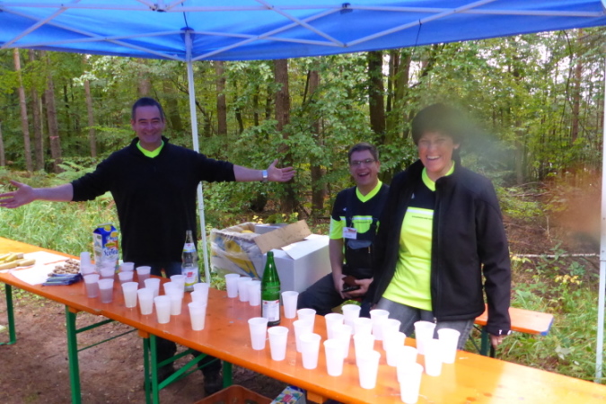 Ich finde den Stein nicht, laufe durch ein Starttor, dahinter der zweite VP. Man bietet mir Obst auf kleinen Tellerchen, Iso, Wasser, Tee, Cola. Ich will nichts, ist ja erst km 7.