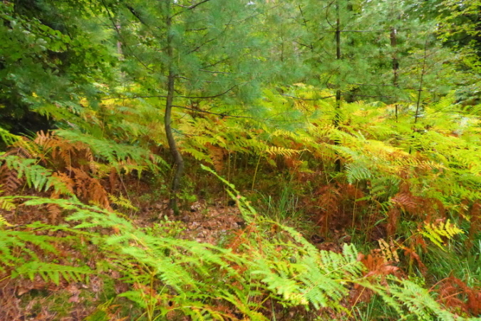 Die Laufstrecke ist nicht matschig, es liegt genug zerbröselter Sandstein rum. Mal ist er gelb, mal blutrot, mal gibt es Heidekraut und Ginster mit tiefschwarzen Samenschoten, mal fette Farnwedel oder goldige Goldruten. Irgendein Flattermann hämmert an Bäumen rum. Es gibt also genug zu futtern, Wildschweine haben den Mittelstreifen in langen Linien aufgepflügt, sodass ich meine Füße plazieren muss.