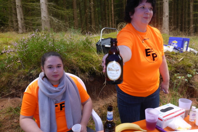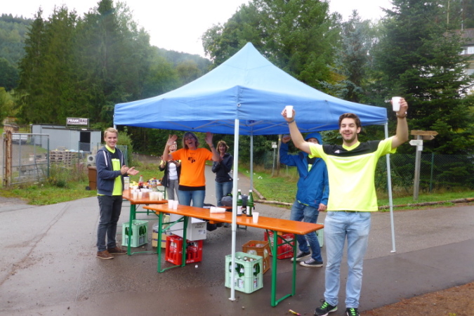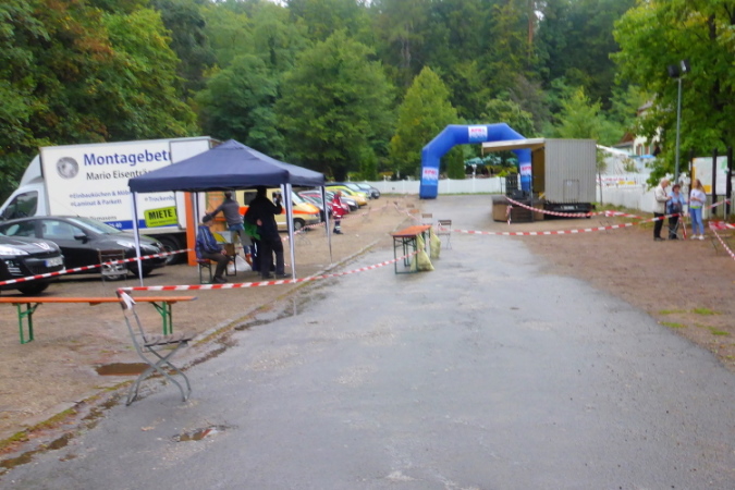 Alles, was auf den Bierbänken sitzt, applaudiert. Das sind schon recht viele, die hätten ja auch mal aufspringen können! Kleine Kurve noch, Medaille und ab zur Theke. Schon sitze ich und warte, wer nach mir ins Ziel kommt. Ich warte lange, es gibt keine offizielle Schlusszeit, keinen Druck, keinen Zwang, keinen Cut-Off, einfach: Nichts! Man hat hier in der Pfalz viel Zeit. Das ist super, das gibt den Läufer Ruhe, das zeichnet diesen Lauf aus. Nachdem der letzte Marathoni durch ist, passiert hier: Nichts mehr!