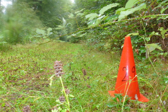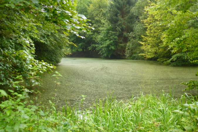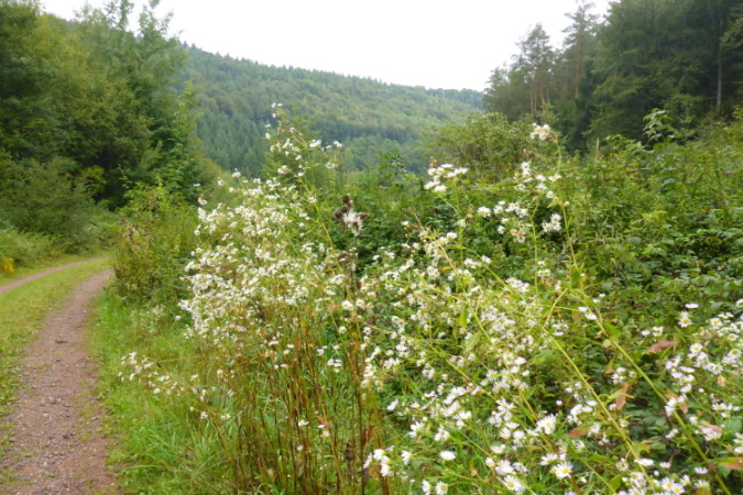 Hier fühle ich mich wohl. Der Wald ist nicht zu dunkel, manchmal gibt er Blicke über waldige Hügel frei, manchmal gibt es hohe Kiefern, unter denen ich mich besser fühle, als unter dichten Buchen. Der schwarze Hollunder lockt mit fetten Fruchtständen, Kindheitserinnerungen. Der rote, den ich suche, ist seltener. Entlang der Bäche blüht das rosa Springkraut, das in der Medizin als Brechmittel genutzt wird und mir Atemnot beschert. Die Bäche selber werden durch eigenartige Konstruktionen in verschiedene Bereiche aufgeteilt. Vielleicht züchtet man Wasserkäfer, denn wer weiß, was die Leute hier essen.