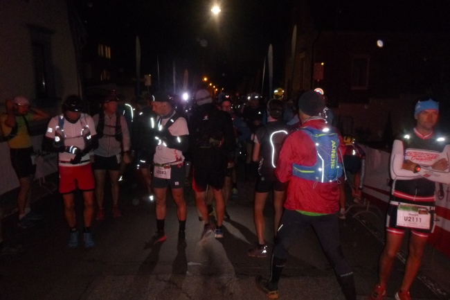 Aber noch sind es so 8 km. Und da gibt es noch viel zu tun. Direkt nach dem Ort liegt ein Bergriegel quer im Weg, da geht’s drüber. Und da schimpfen auch die Half- und Quartertrailer. Denn hier führen die Strecken zusammen. Obwohl bestimmt so 700 Läufer mit 1400 Füßen durch sind, sind die weißen Pfeile aus Mehl immer noch klar und überdeutlich. Da erkennt man die Markierungsprofis! Hat man den Berg geschafft, folgt ein breiter Weg, genau das Tal entlang, dem wir heute früh im Finstern schon gefolgt sind - nur auf der anderen Seite. Teiche liegen dazwischen. Häuser und Asphalt gibt es dann in OberUnterMittelseligenhof. Nur durch. Alle gucken gerade heute-Nachrichten, keiner ist draußen. Es ist auch wieder kalt, einstellig. Die Sonne verschwindet hinter den Hügeln.
