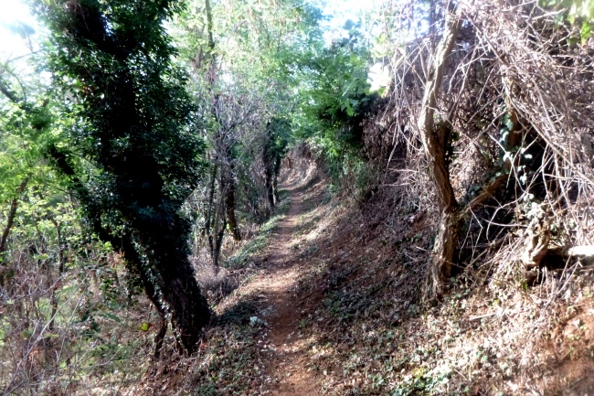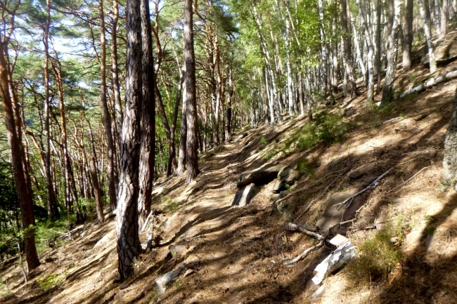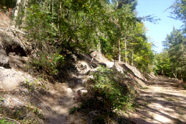 Die Strecke (auf und ab, man erinnert sich) führt in weiten Bögen mal oben, mal weit unten am Hang längs. Manchmal am selben Hang, was natürlich interessante Abkürzungen zuließe. Wäre da nicht ein unglaublich steiler Hang, total ungangbar, dazwischen…Die Strecke auf der Karte sieht jedenfalls aus wie ein zerknülltes Stück Papier. Und da, wo man bequem abkürzen könnte, stehen Posten. Man weiß ja nie.